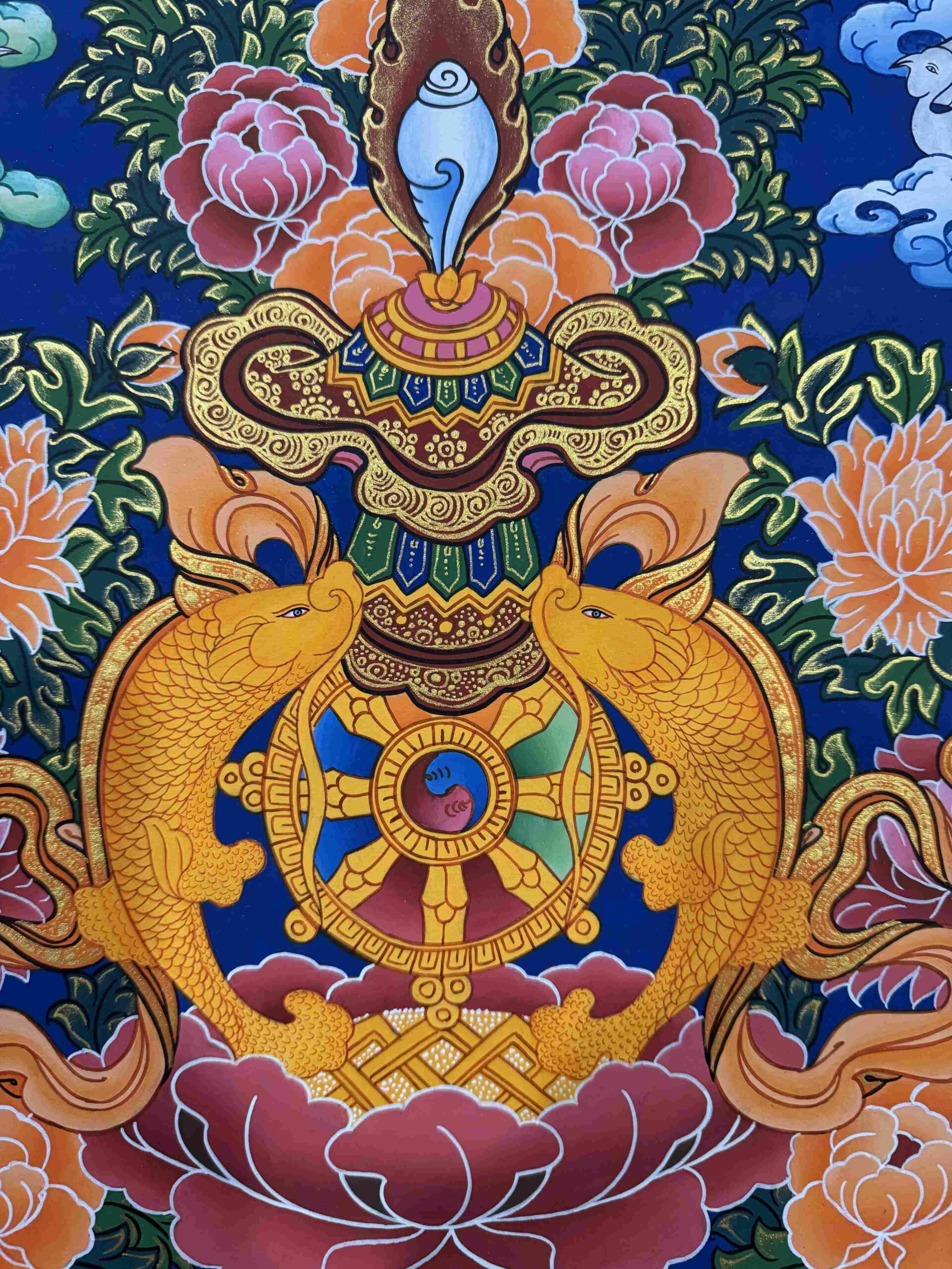 •The banner symbolizes the victory of Buddha’s teachings. •The golden fishes announce the release from suffering.