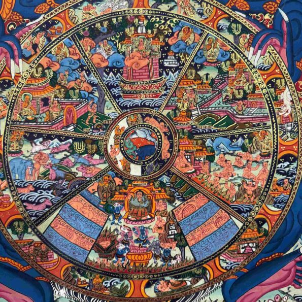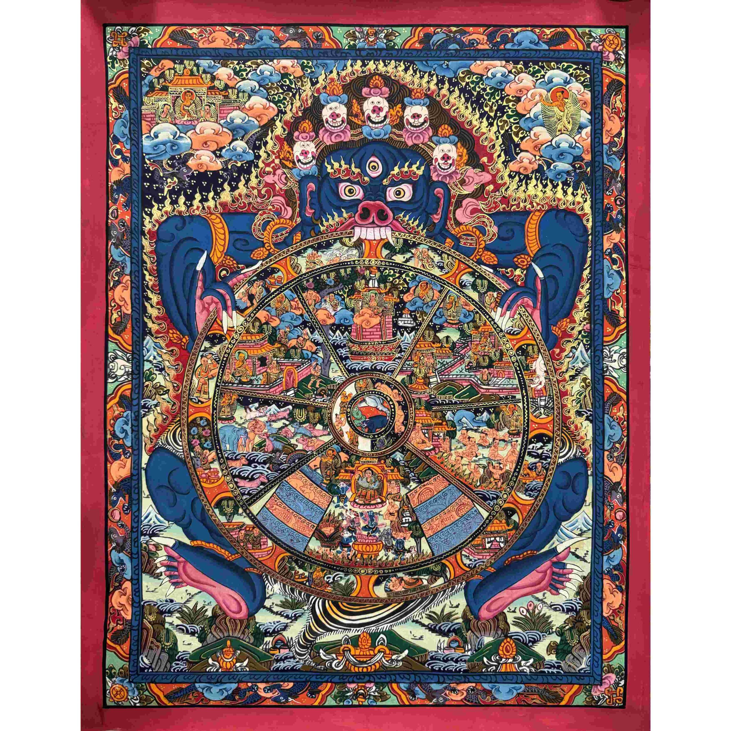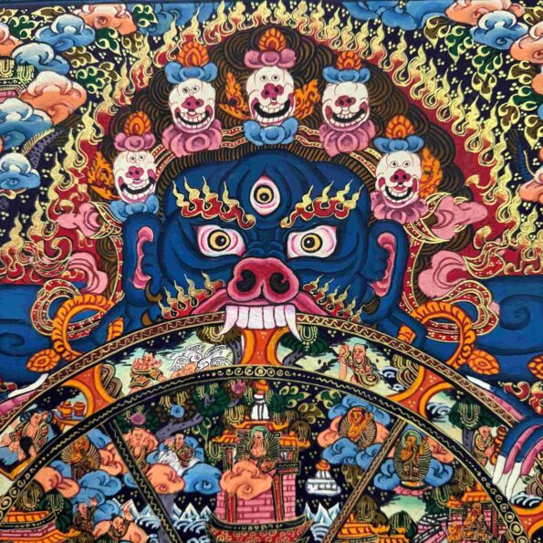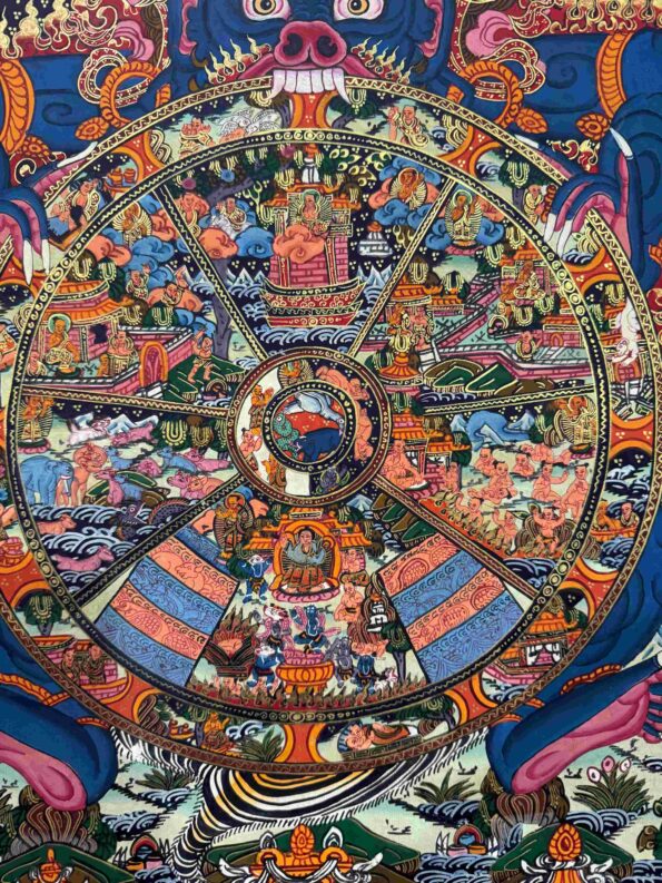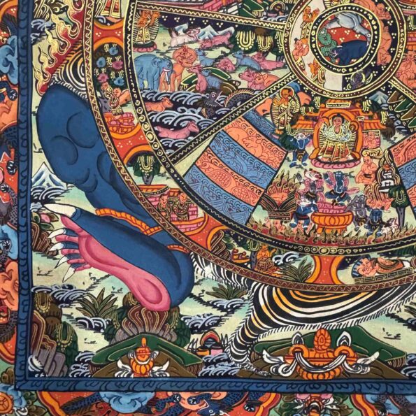 The wheel is being held by a fearsome figure who represents impermanence. This figure is most commonly depicted as Yama, the lord of death. Regardless of the figure depicted, the inner meaning remains the same–that the entire process of cyclic existence (samsara) is transient; everything within this wheel is constantly changing.