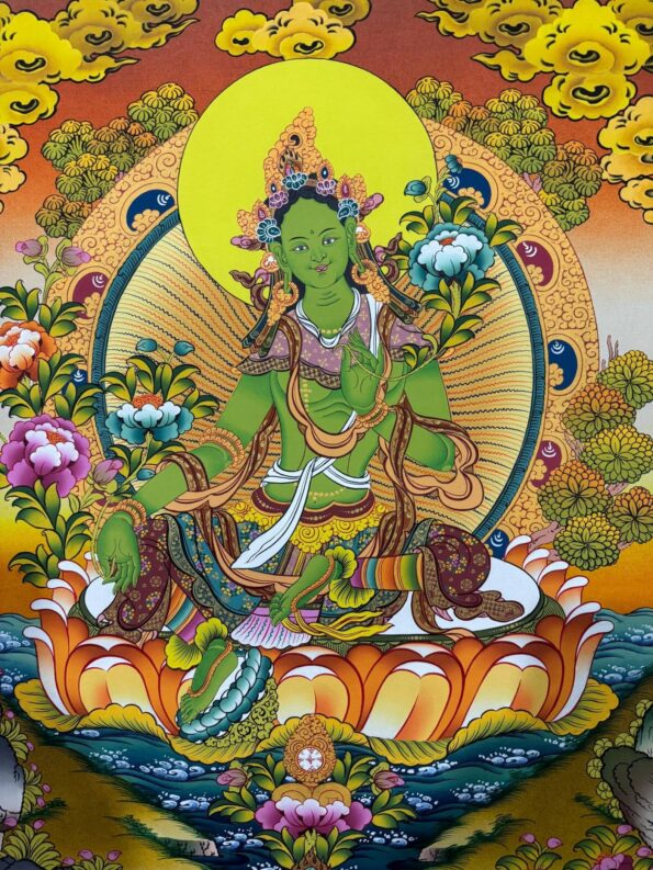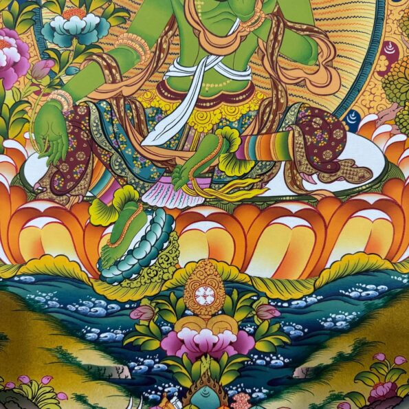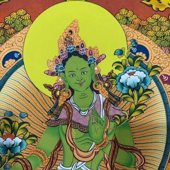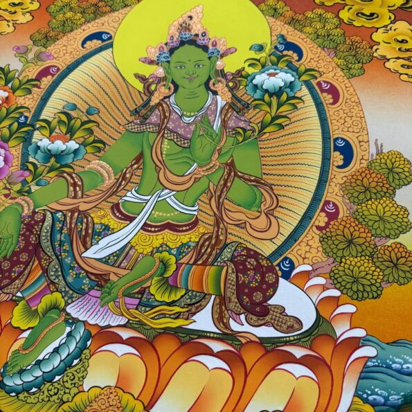 Green Tara is a female Buddha and one of the most well-known goddesses in the Buddhist world. Tara has many forms and appears in various colors. with each colors representing a different aspect of her energy. She is known as Doljyang or Dolma in Tibetan, literal meaning is liberating mother. She is the embodiment of all the buddhas and Bodhisattvas of three times in female form. There is believe that one who is connected to Tara, he / she won’t be suffer from famine, poverty, fear, elemental disasters and so forth. Green Tara offers protection from all the unfortunate circumstances one can encounter within the samsaric world.