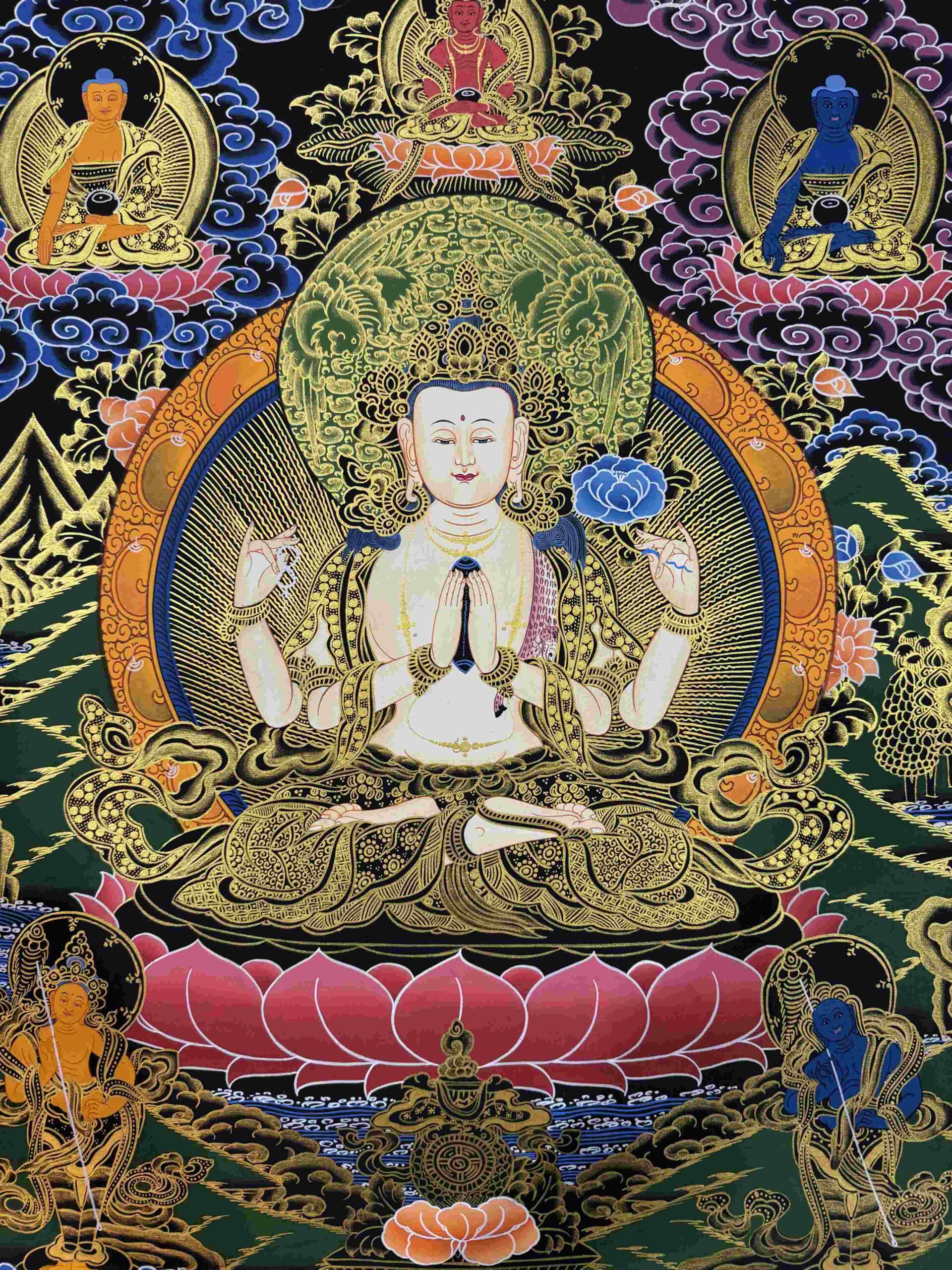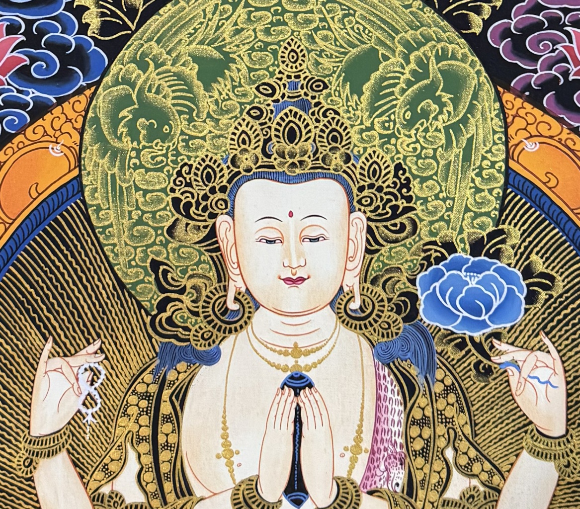 Chenrezig is white in color and four-armed, holding a rosary in one hand and a full-blown lotus in the other. The palms of the other two main hands are united in Namaskar Mudra, and they are clutching a circular object known as “jewel”, which is regarded as a symbol of knowledge.