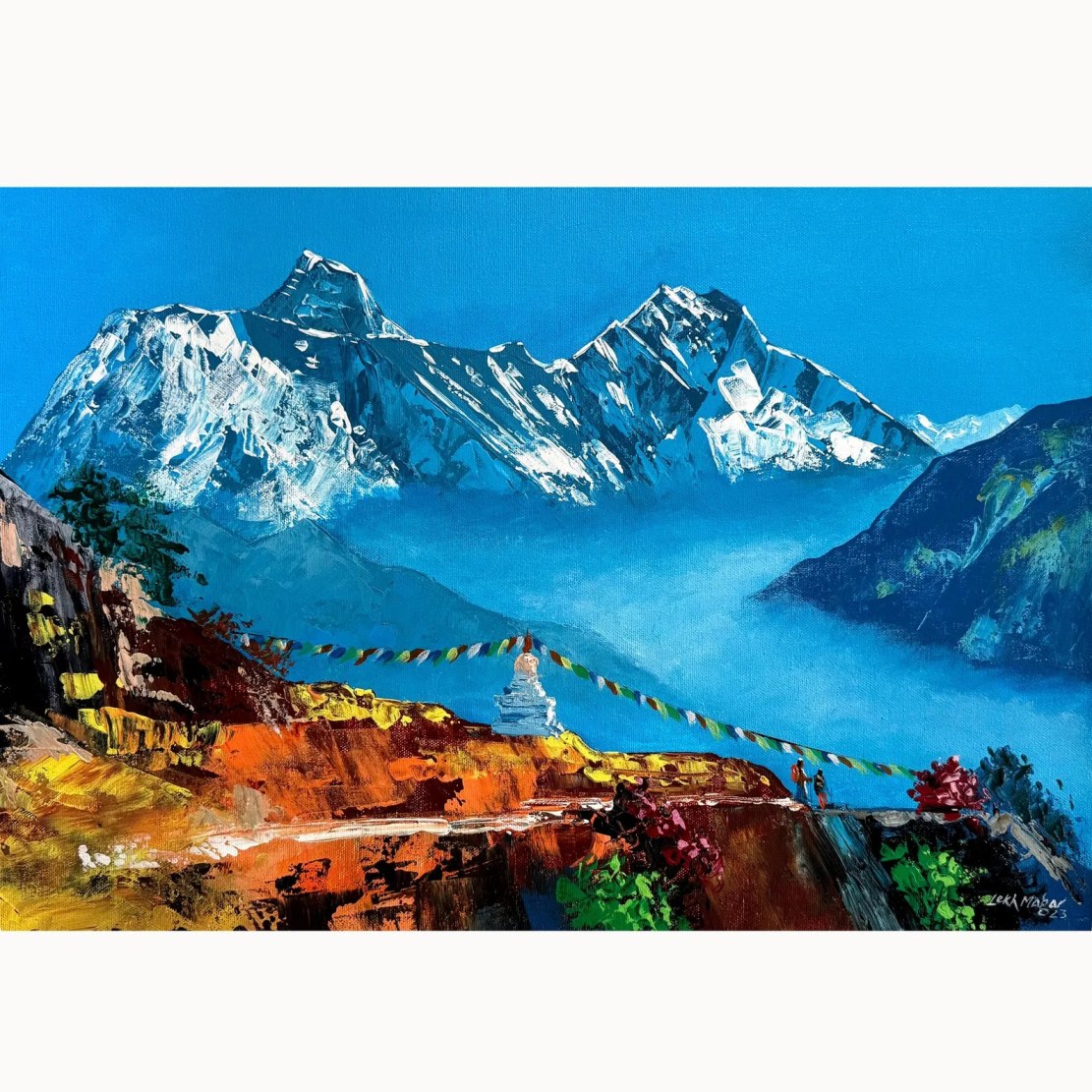 Each brushstroke radiates the energy of the Himalayas, from the crisp air of the high mountains to the peaceful rhythm of daily life in the foothills. Perfect for mountain lovers, trekkers, or anyone drawn to Nepalese culture and landscapes, this painting is a meaningful centerpiece for any home, office, or meditation space.