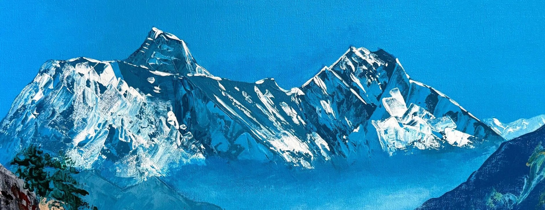 Bring the majestic beauty of the Himalayas into your space with this stunning acrylic painting of Mount Everest. This artwork captures the awe-inspiring presence of the world’s tallest peak, painted in vibrant hues of blue and white that highlight the snow-covered ridges beneath a clear sky.