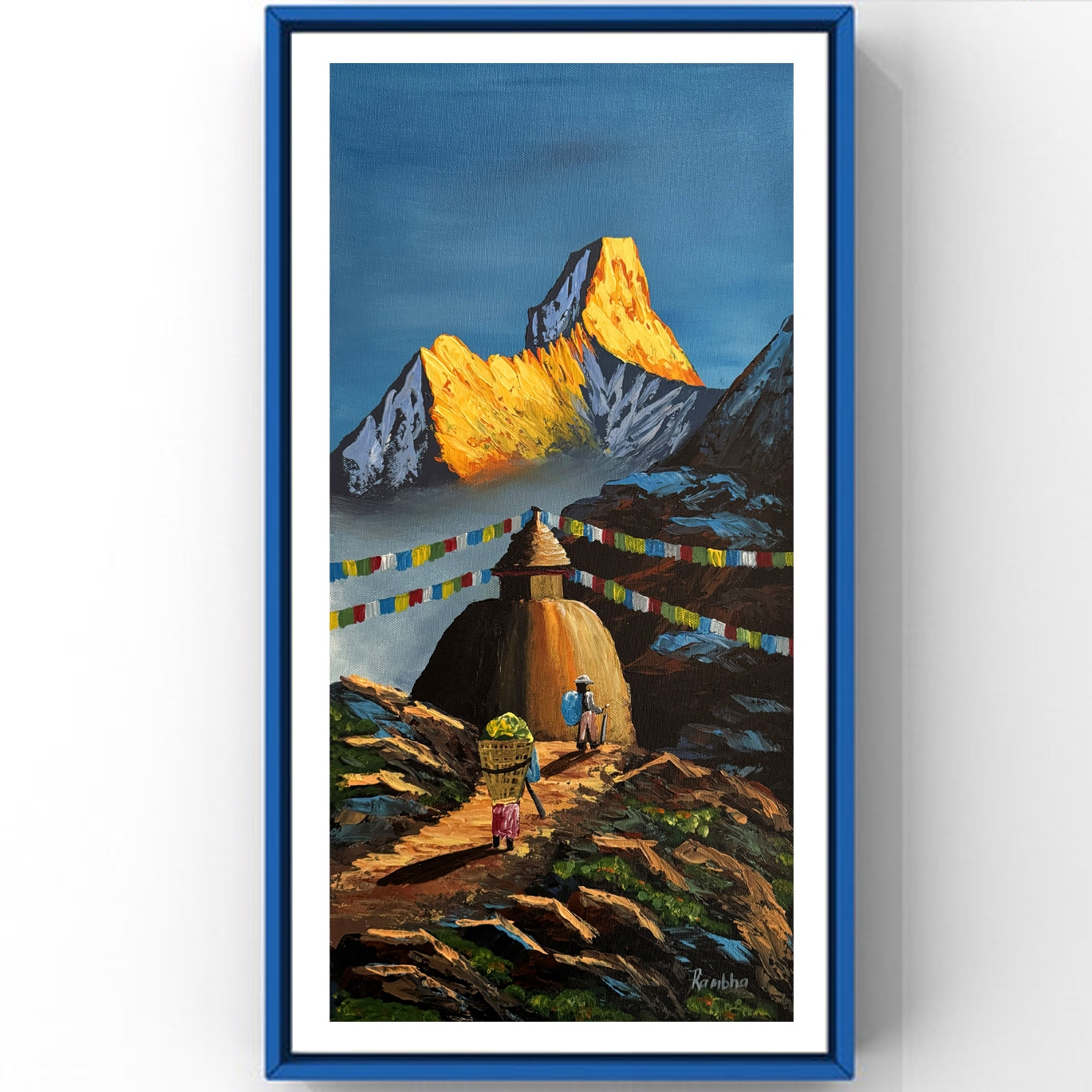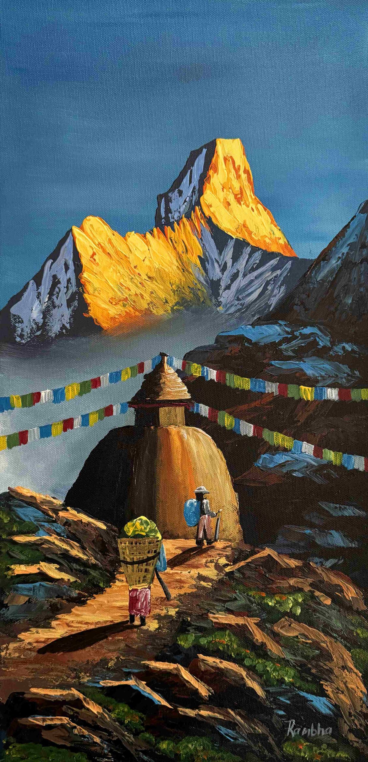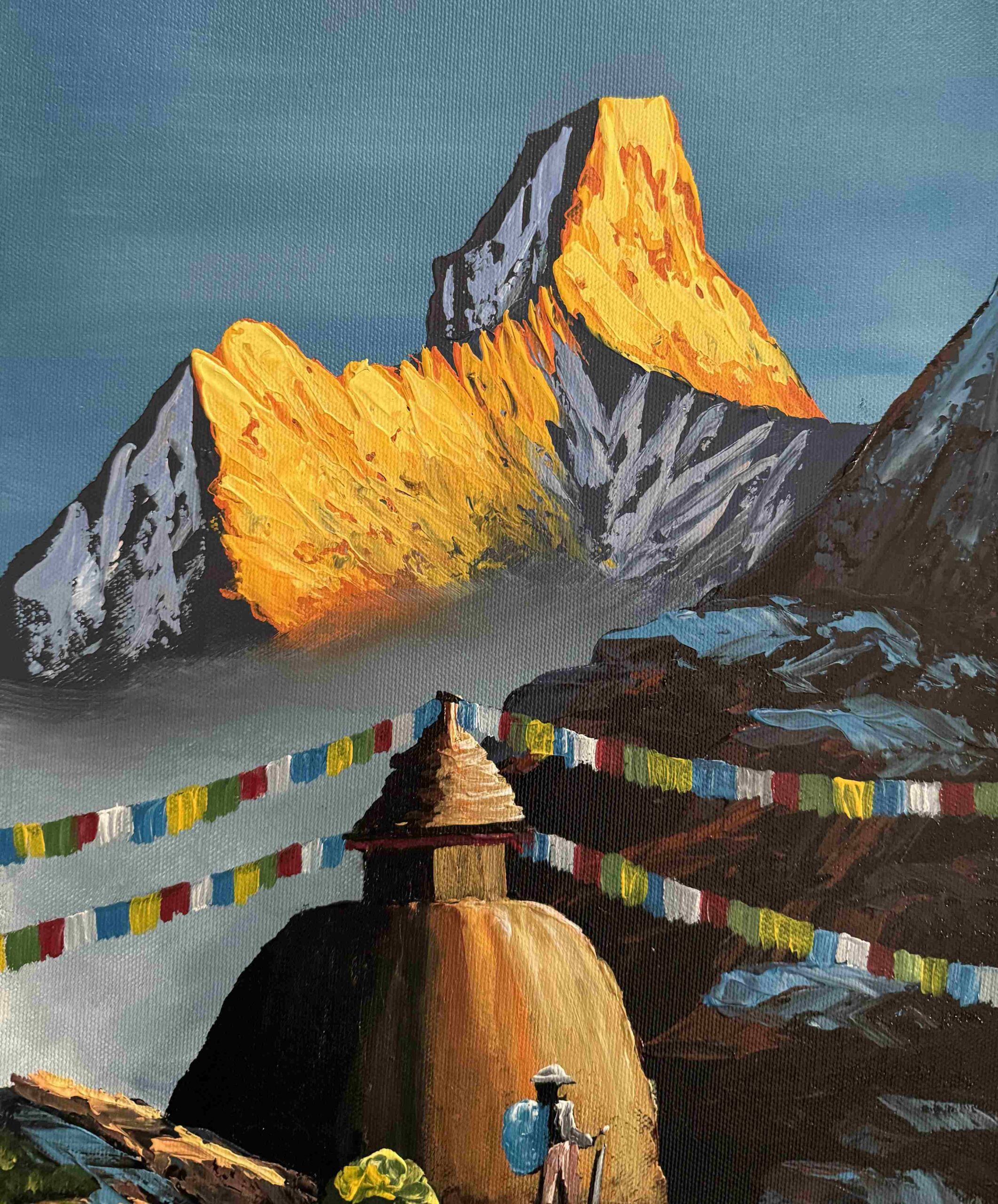 This beautiful acrylic painting captures the majestic presence of Ama Dablam glowing under the warm light of sunrise. The golden rays illuminate the sharp peaks of the mountain, creating a dramatic contrast against the cool blue sky and surrounding Himalayan landscape. In the foreground, a traditional Buddhist stupa stands peacefully along a rugged mountain trail, adorned with colorful prayer flags that flutter across the path, symbolizing blessings carried by the wind.