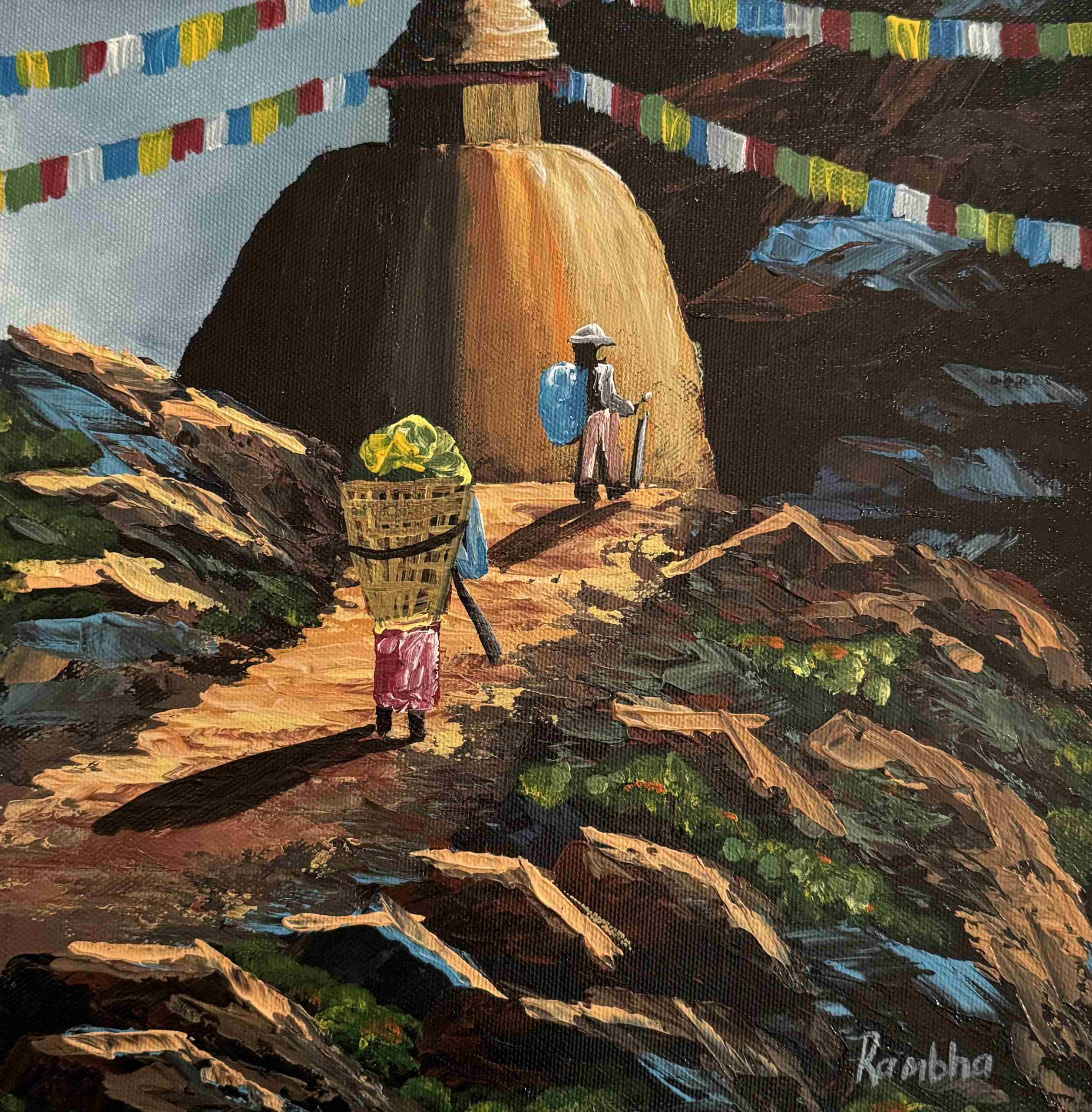 Two travelers walk toward the stupa, adding a sense of journey and devotion to the scene, while the earthy textures of the rocky trail and alpine terrain bring depth and realism to the composition. The painting beautifully blends the spiritual atmosphere of the Himalayas with the awe-inspiring natural beauty of the mountains.
