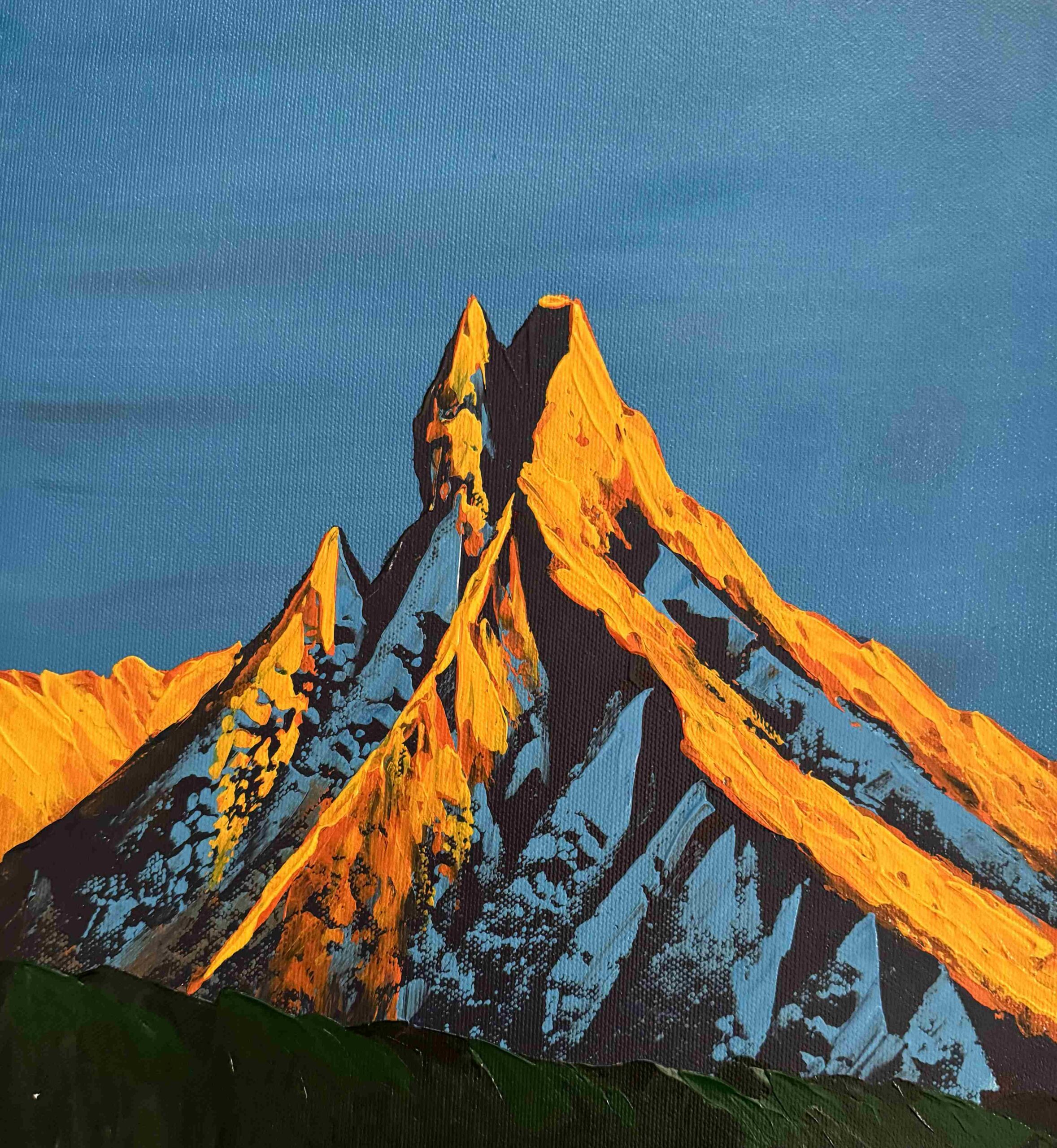 This beautiful acrylic painting captures the majestic presence of Machapuchare, one of the most iconic and sacred peaks of the Nepalese Himalayas. The mountain rises dramatically into a clear blue sky, its sharp twin summits glowing in warm golden light as the first rays of sunrise illuminate the snow-covered ridges.