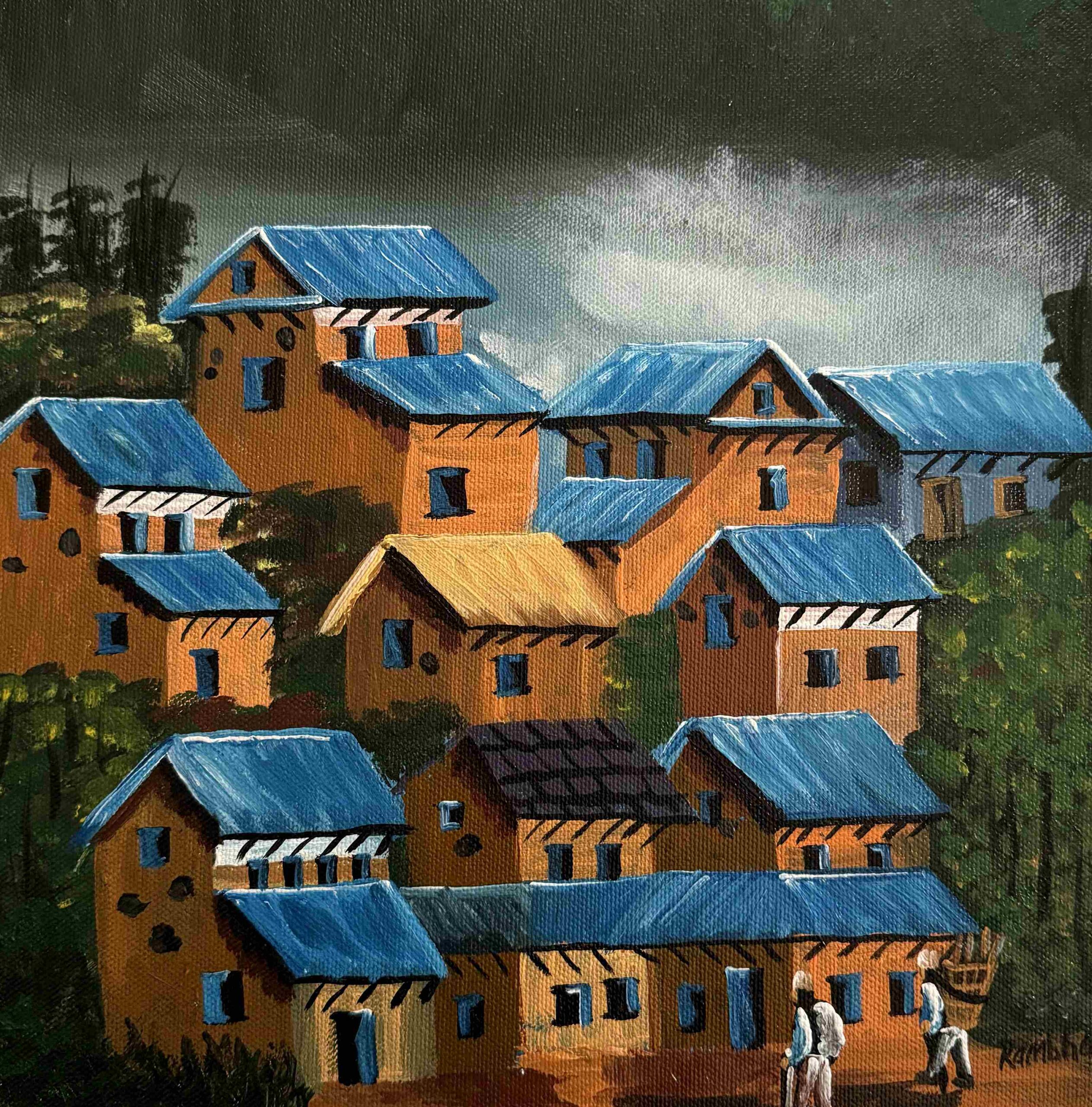 Painted with rich textures and vibrant acrylic colors, this artwork beautifully blends natural grandeur with cultural charm. The striking contrast between the glowing mountain peaks, the deep green hills, and the warm earthy tones of the village creates a visually captivating composition.