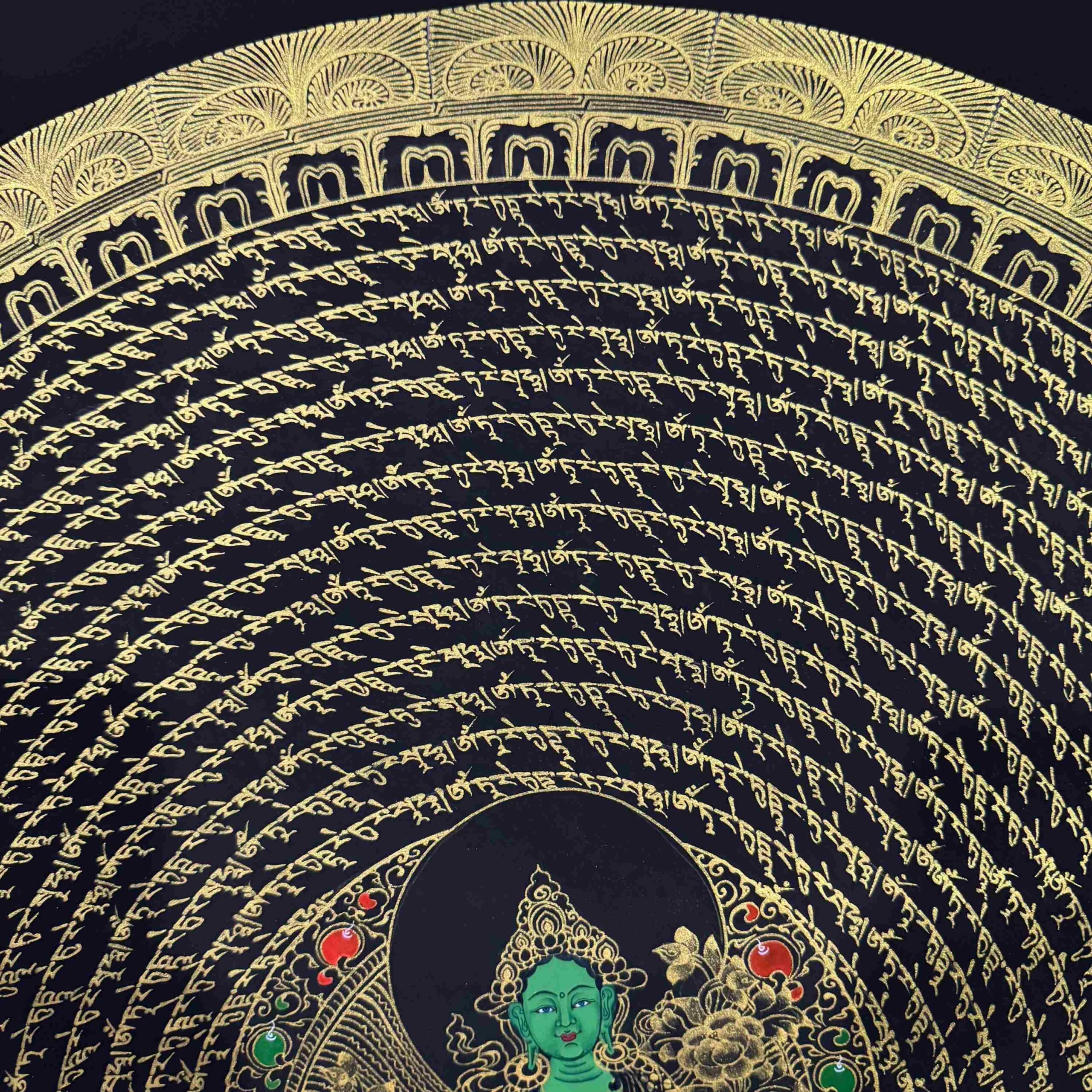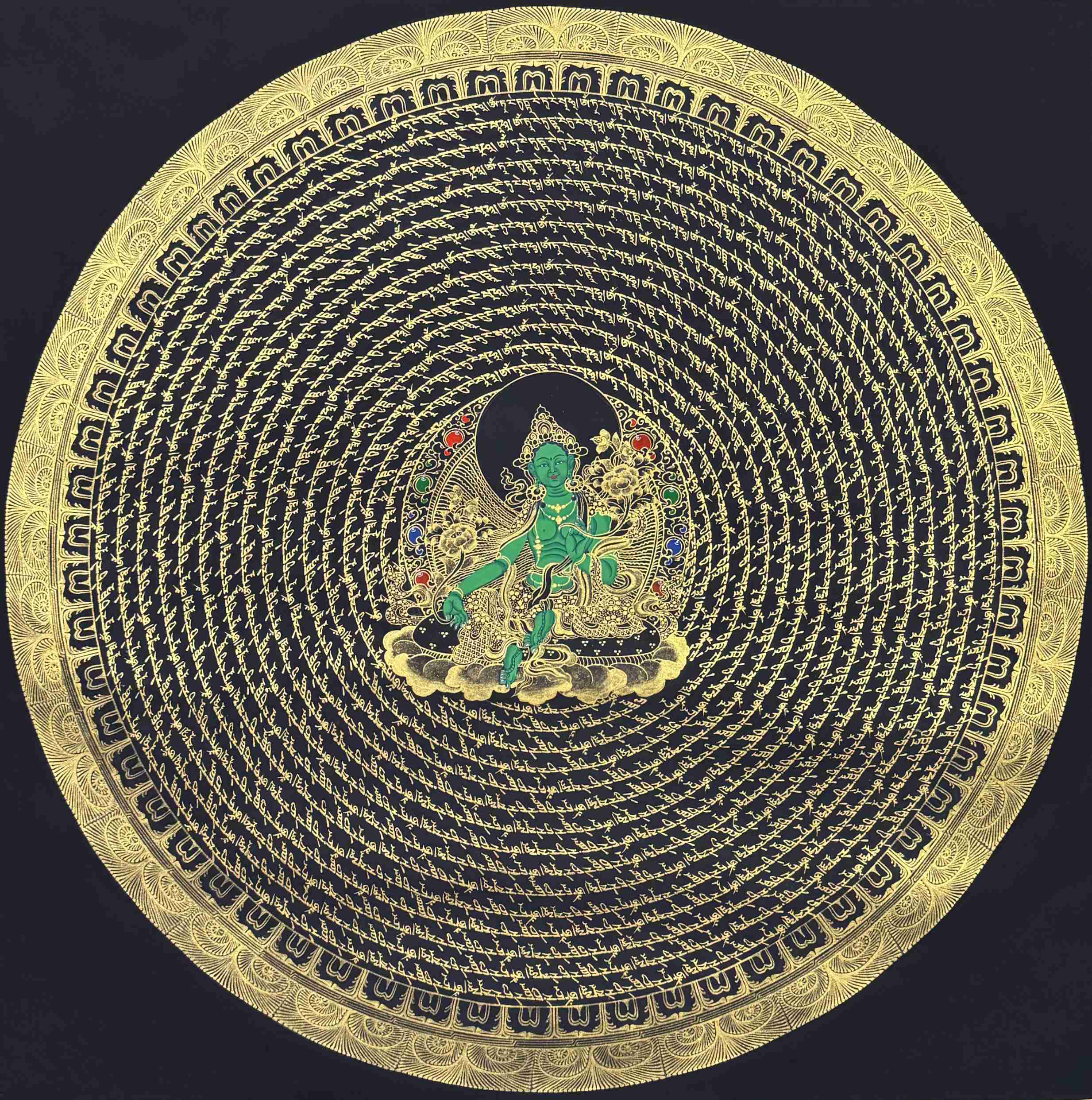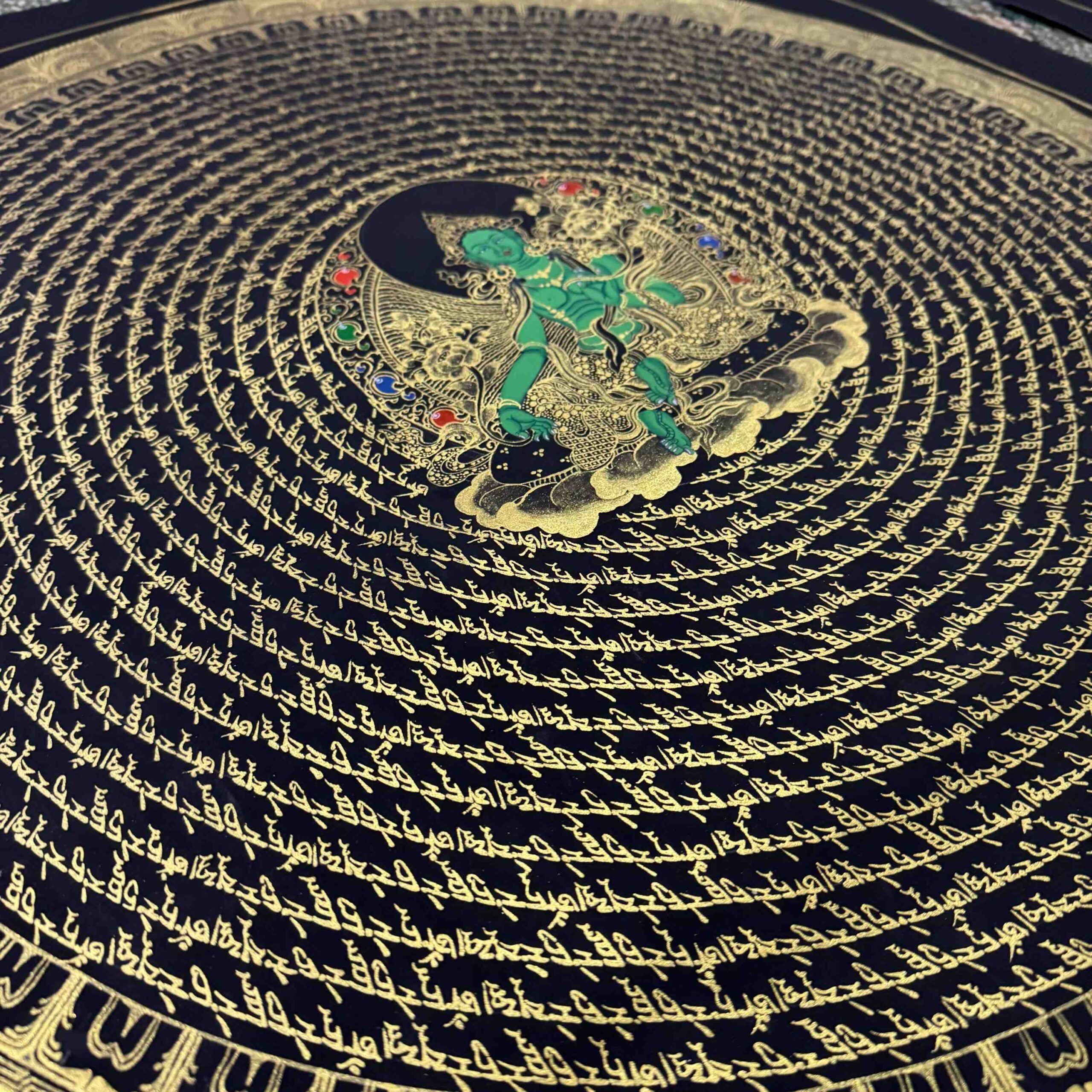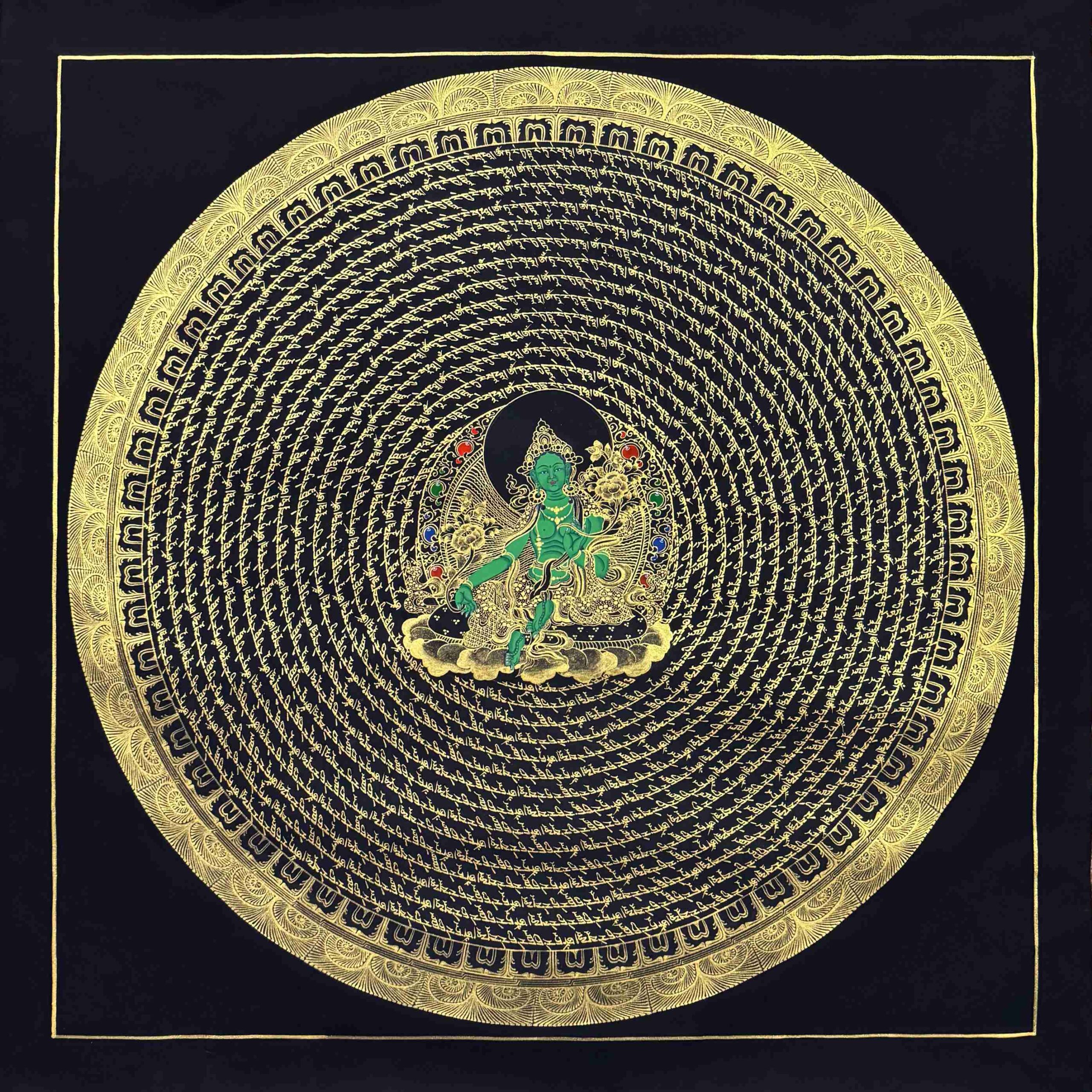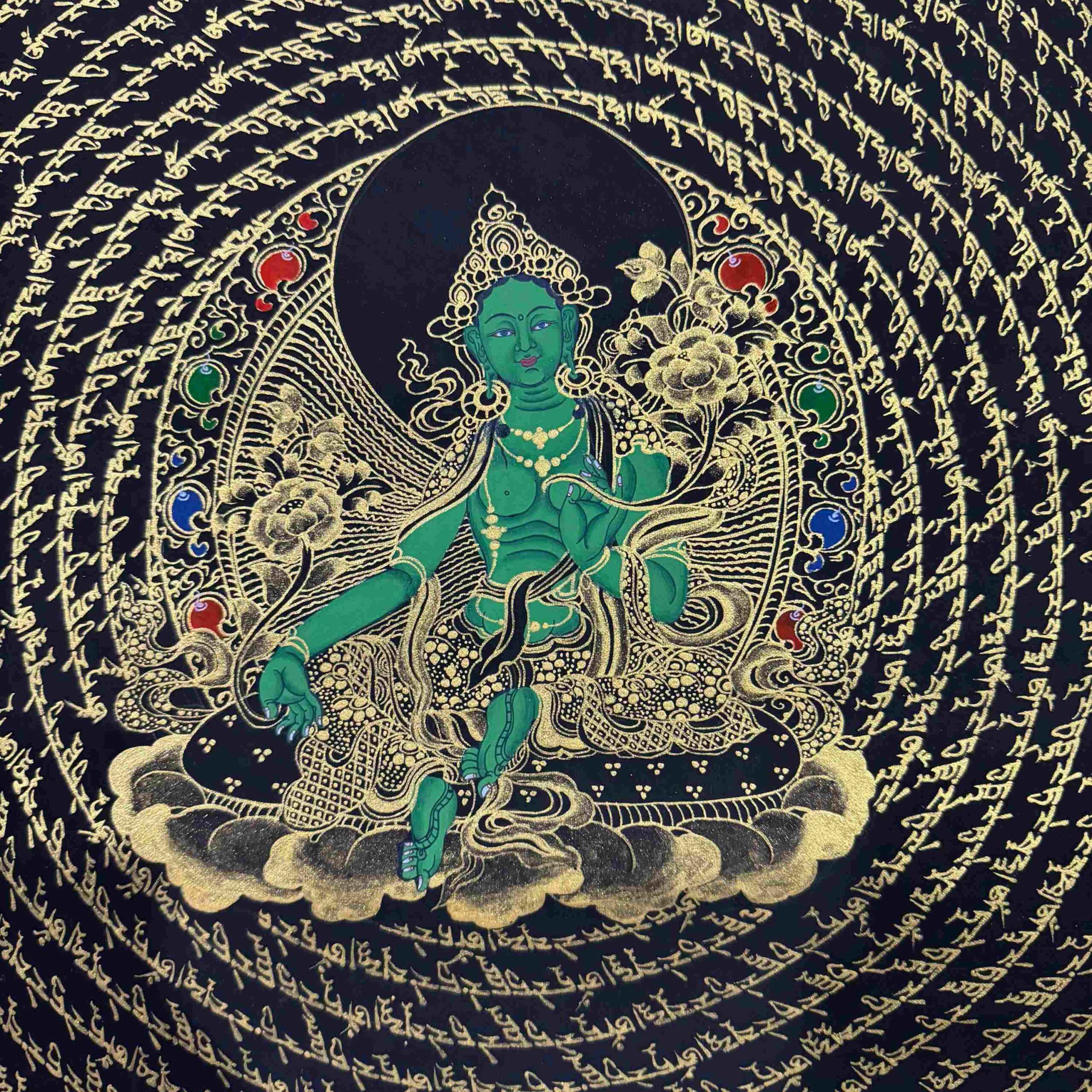 This exquisite Green Tara Mantra Mandala Thangka beautifully combines sacred art and spiritual symbolism. At the center of the painting sits Green Tara, the compassionate goddess of swift action and protection, depicted in her serene yet powerful posture. Surrounding her in perfect circular harmony are countless repetitions of her sacred mantra — “Om Tare Tuttare Ture Soha” — meticulously hand-painted in golden script to form a radiant mandala.