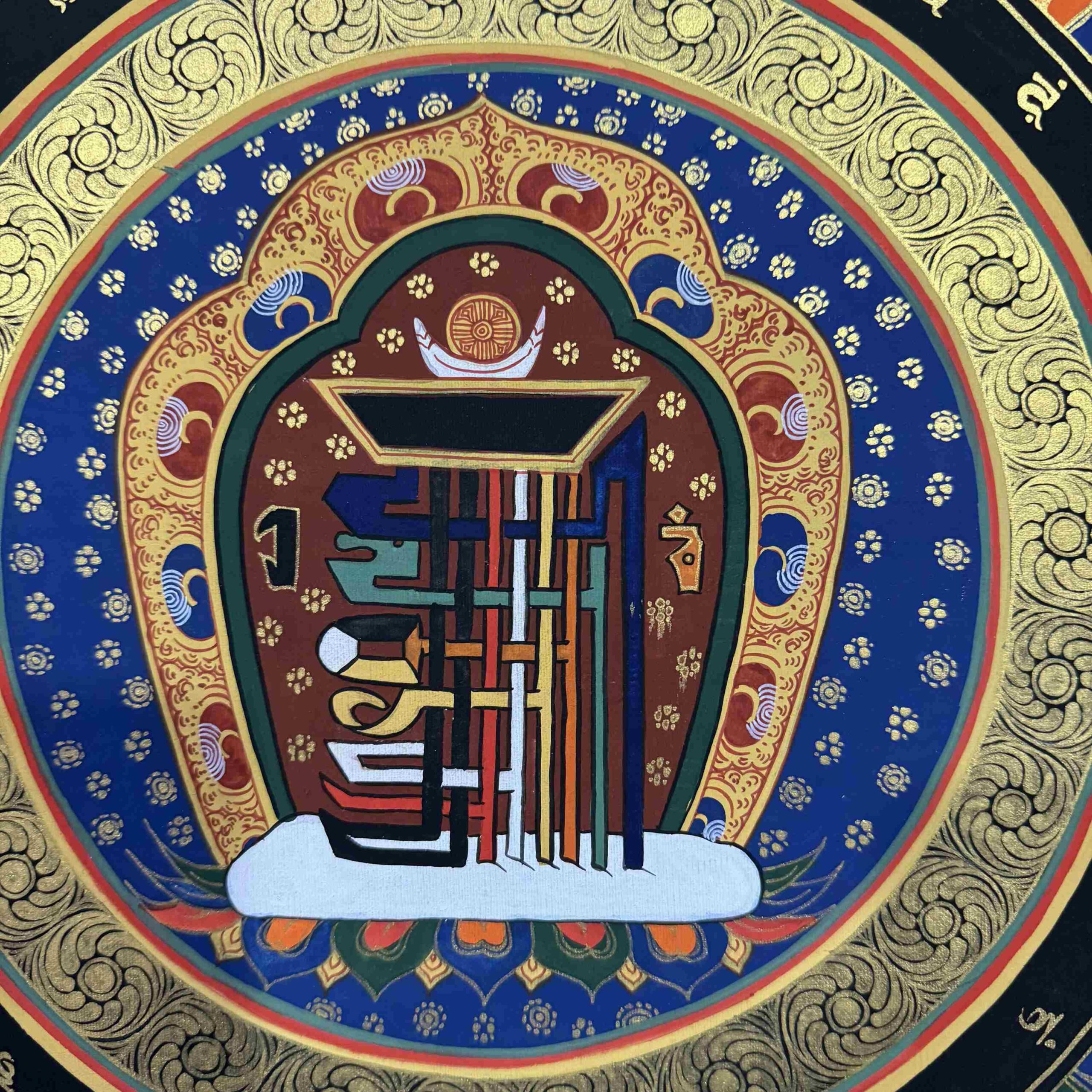 The Kalachakra seed syllable or Tenfold Powerful One is the best known symbols of the Kalachakra system, and probably of the entire Tibetan tantric tradition. The symbol consists of an ornamental ring of fire, then the main symbol which combines seven individual syllables, on top are a crescent, a disc and a curved shape, making ten.