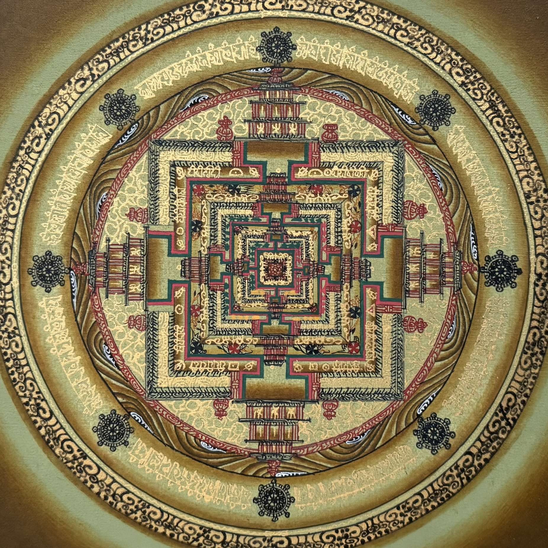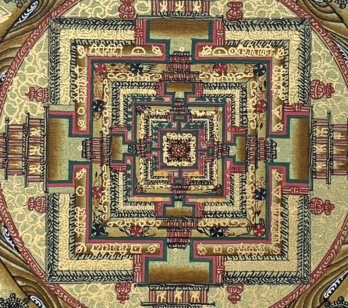 Kalachakra Mandala is a Sanskrit word for “wheel of time”. The mandala of kalachakra is aerial view of the kalachakra temple, situated in Lhasa and contains 722 Deities, and at its heart on a Lotus flower, a single Buddha: Kalachakra. It is a 5 level structure, each level is represented by a square, and each square is set within the others. In mandala there are six circles of elements: wisdom, space, wind, fire, water and earth. Then we get to different entrance of the body, speech and mind.