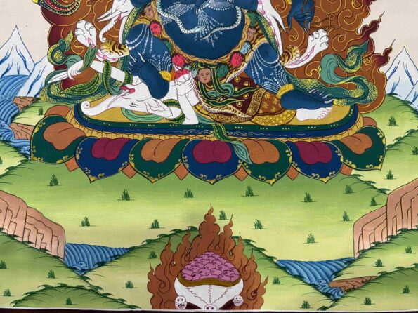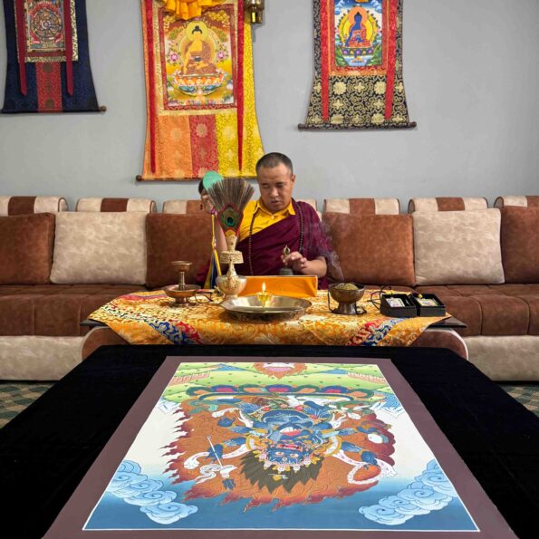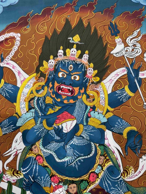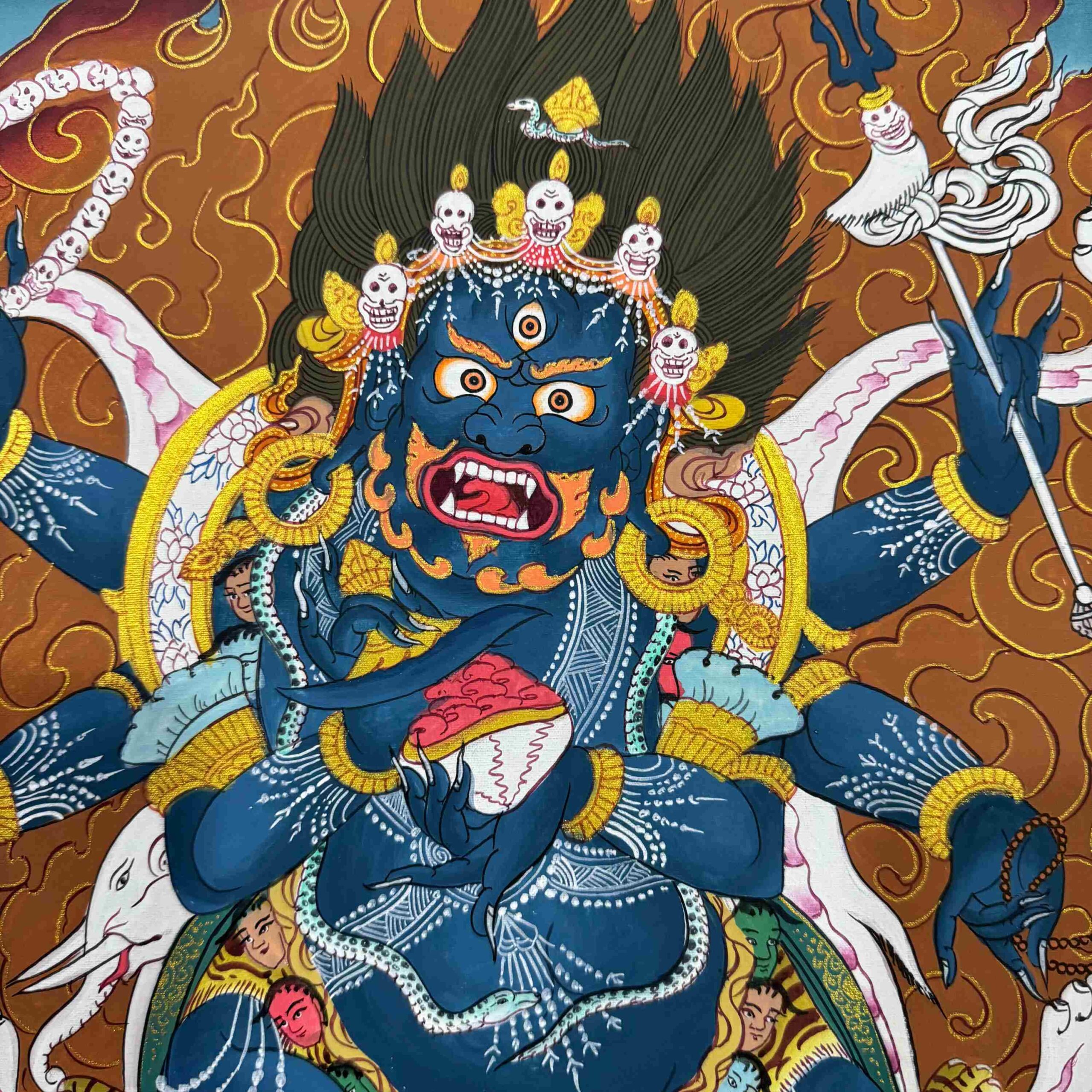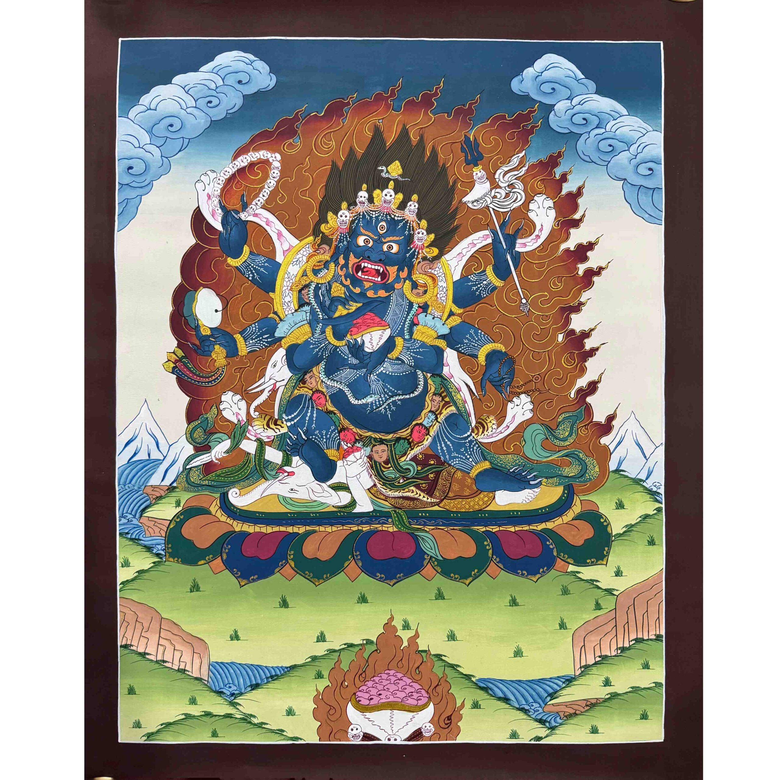 Mahakala Thangka represent the protector of Buddhism Dharma, Mahakala helps to destroy confusion and ignorance and provide wisdom, pacify hindrances and enrich your life. Mahakala is almost always depicted with a crown of five skulls, which represent the transmutation of the five kleshas (negative afflictions) into the five wisdoms. The most notable variation in Mahakala’s manifestations and depictions is in the number of arms, but other details can vary as well. For instance, in some cases there are Mahakalas in white, with multiple heads, without genitals, standing on varying numbers of various things, holding various implements, with alternative adornments, and so on.