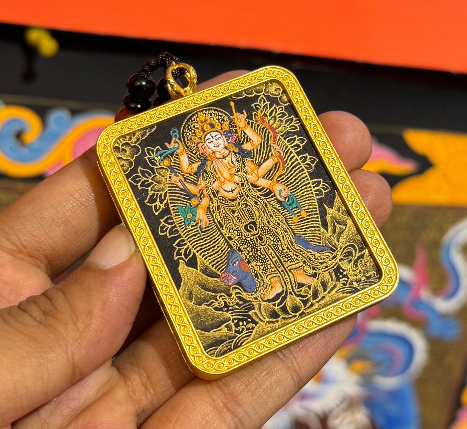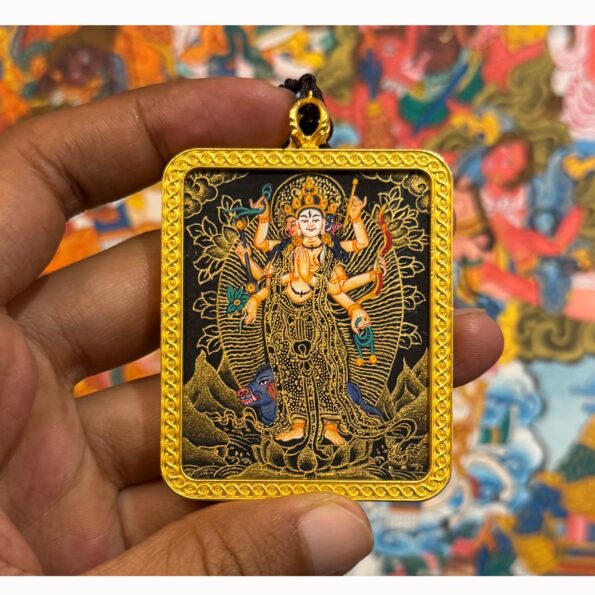 This beautifully hand-painted thangka pendant features Marici (Ozer Chenma), the Buddhist goddess of light and dawn, depicted in her radiant standing form. Marici is revered as a powerful protector who dispels darkness, fear, and obstacles, while granting clarity and wisdom to practitioners.