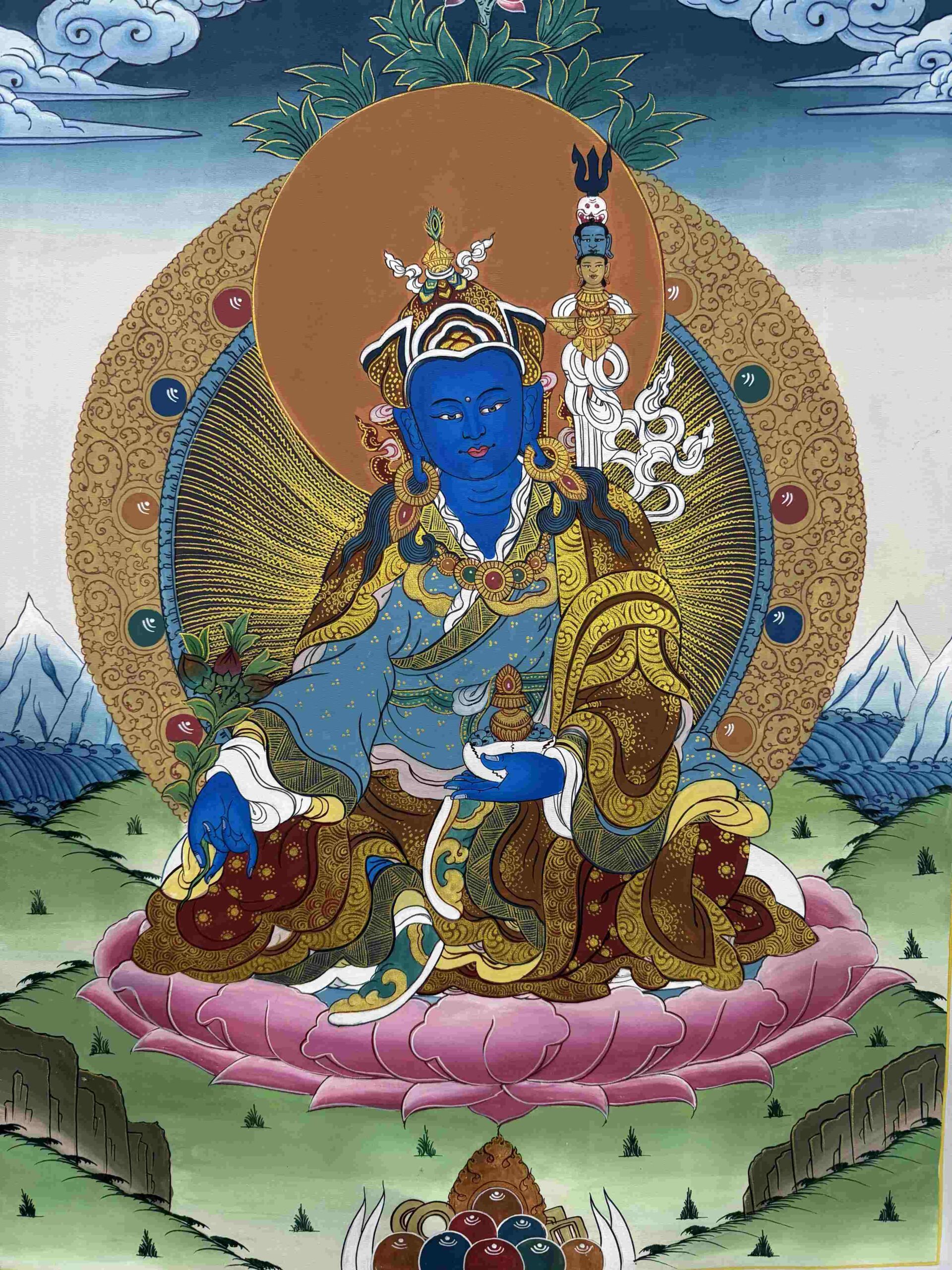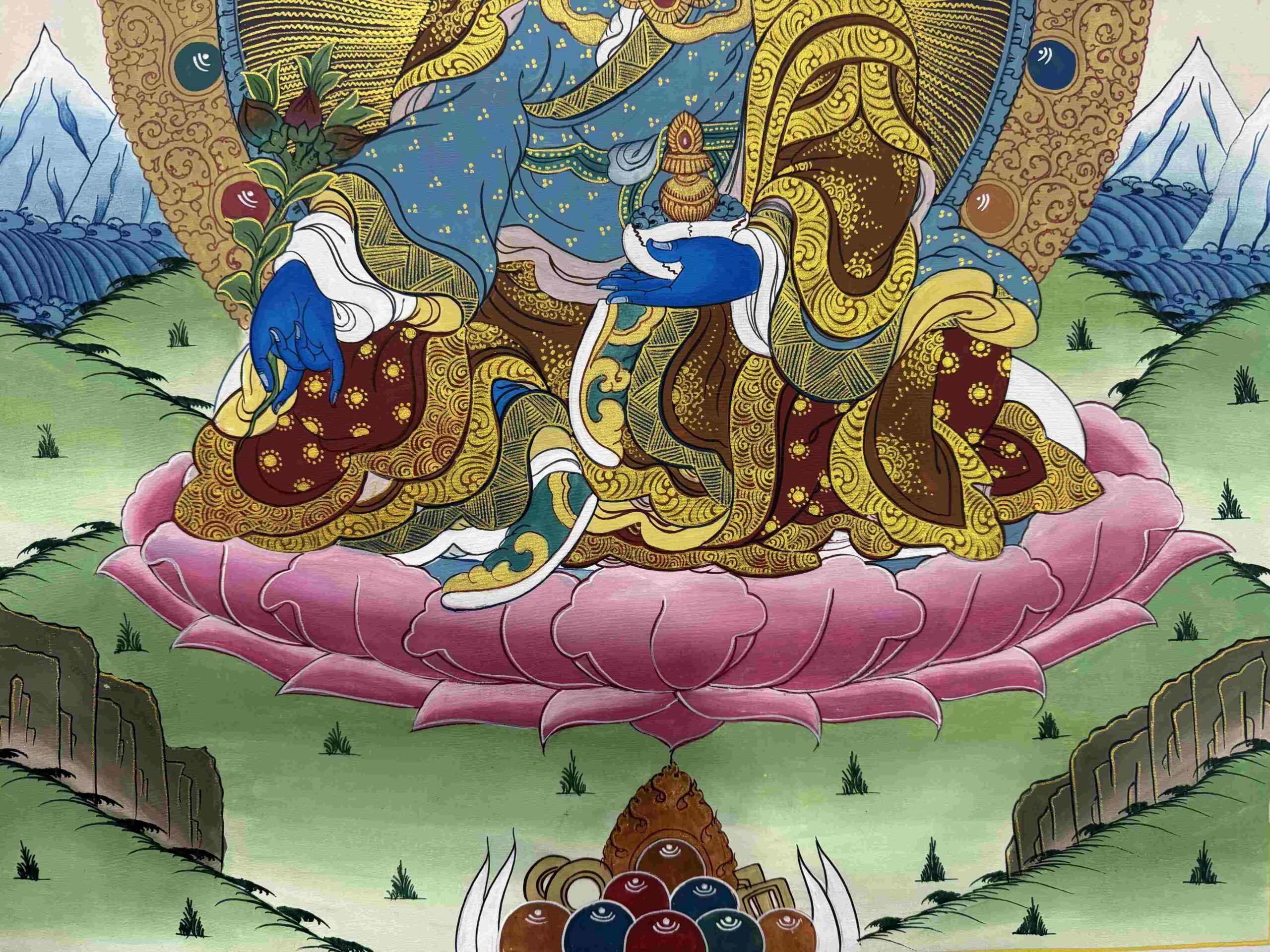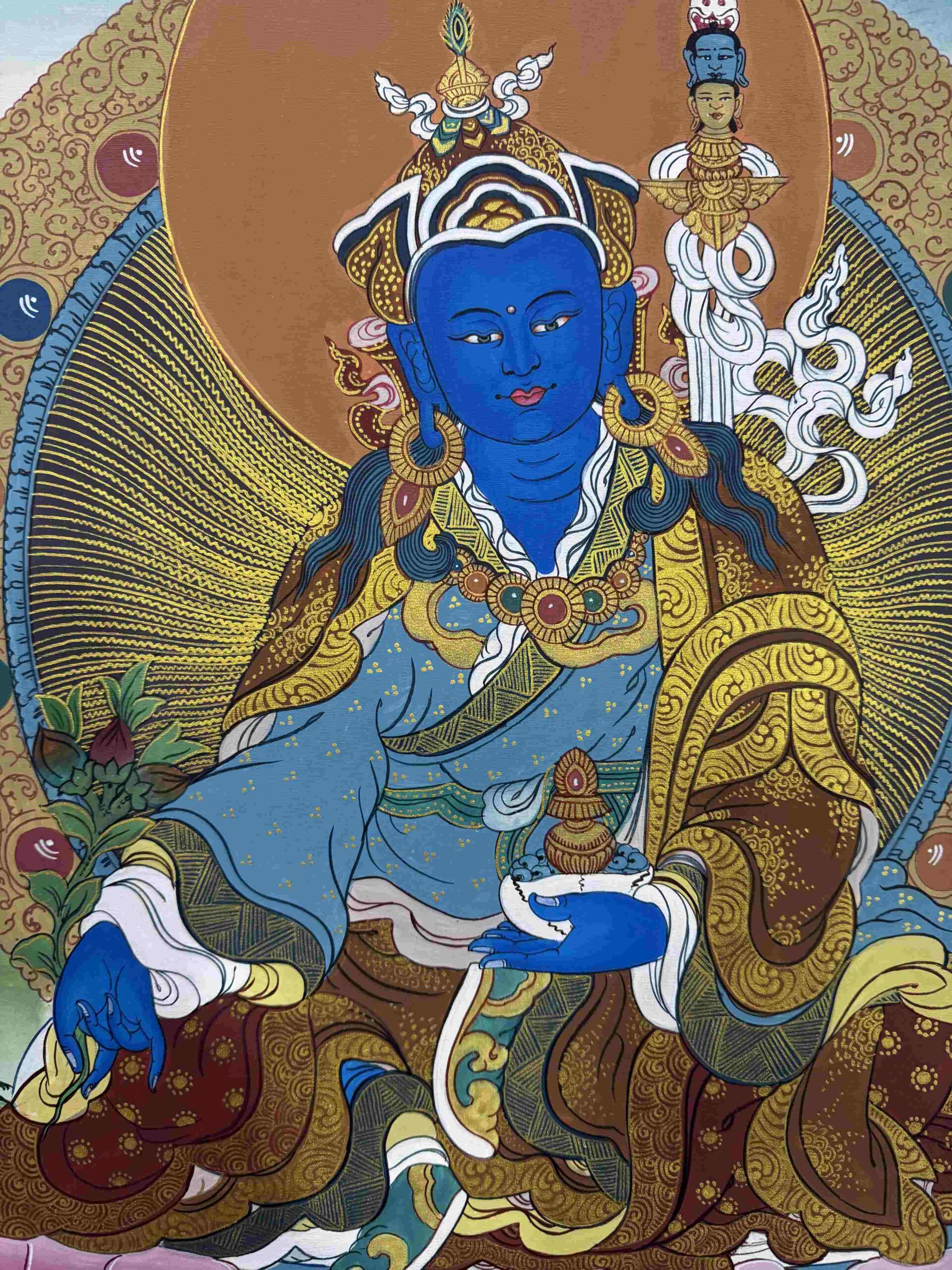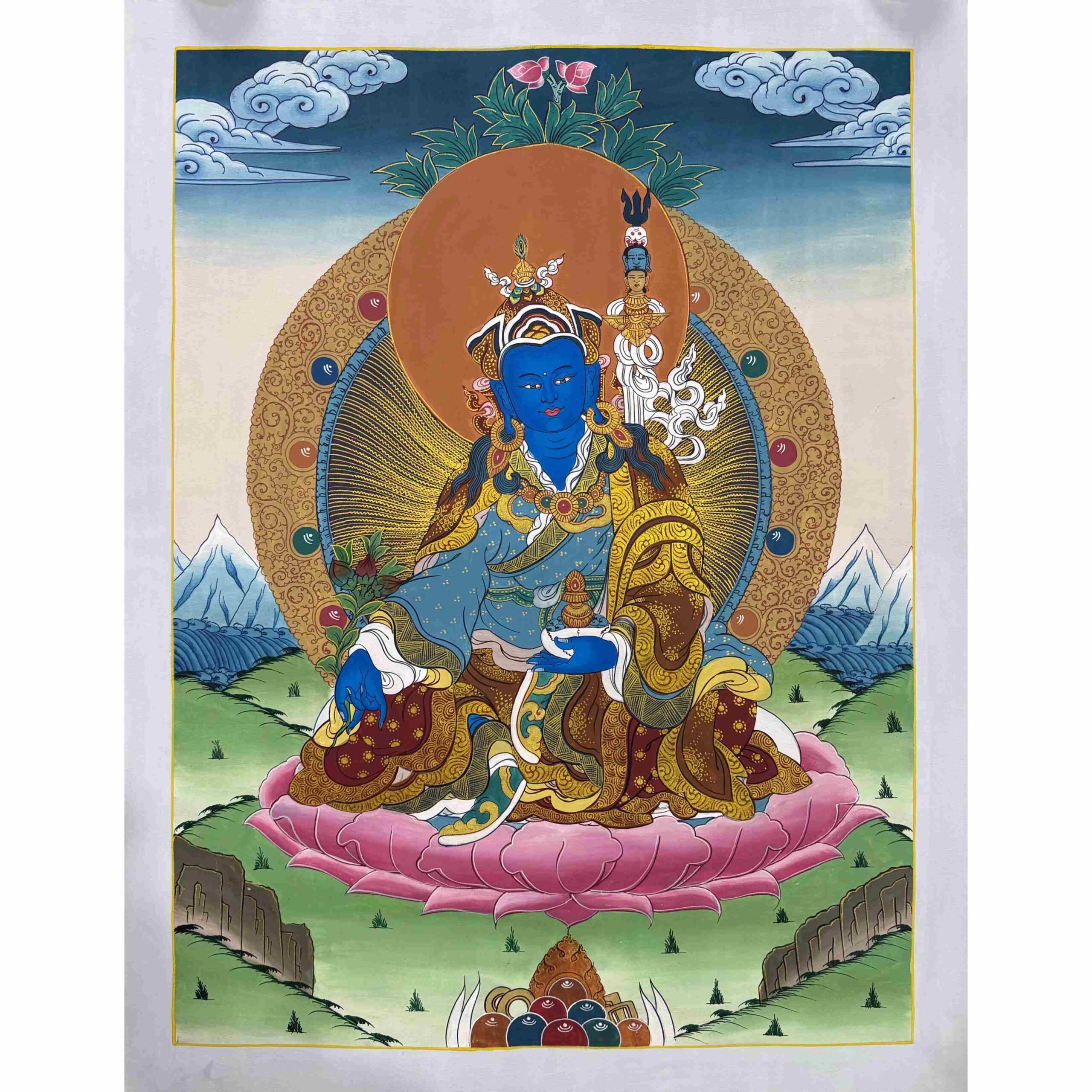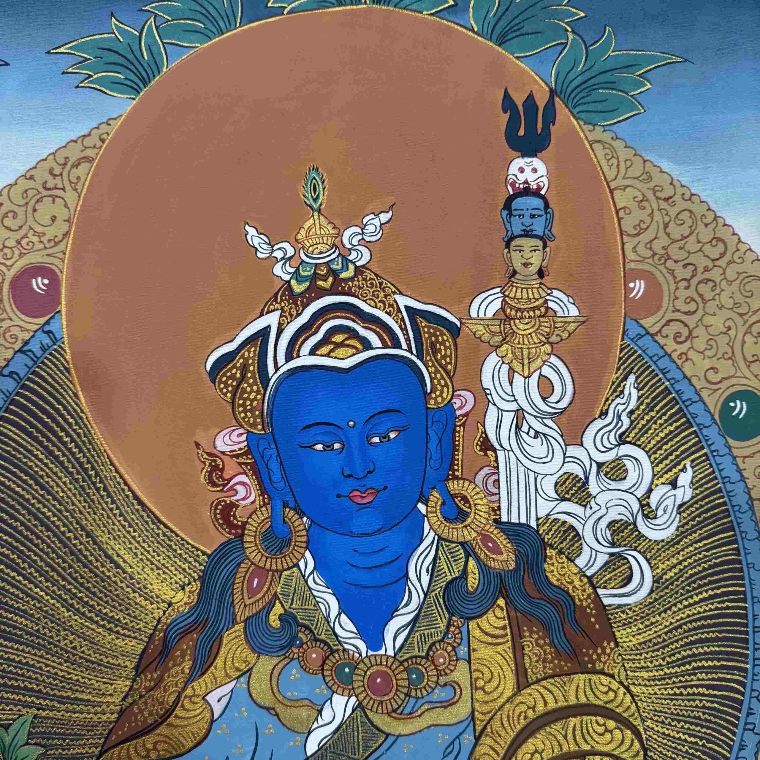 This beautiful thangka painting portrays Guru Orgyen Menlha, the healing form of Guru Padmasambhava, who embodies the combined blessings of the Medicine Buddha (Bhaisajyaguru) and Guru Rinpoche. Depicted in deep lapis-blue, Guru Orgyen Menlha radiates an aura of healing energy, wisdom, and compassion that soothes both physical and spiritual ailments.