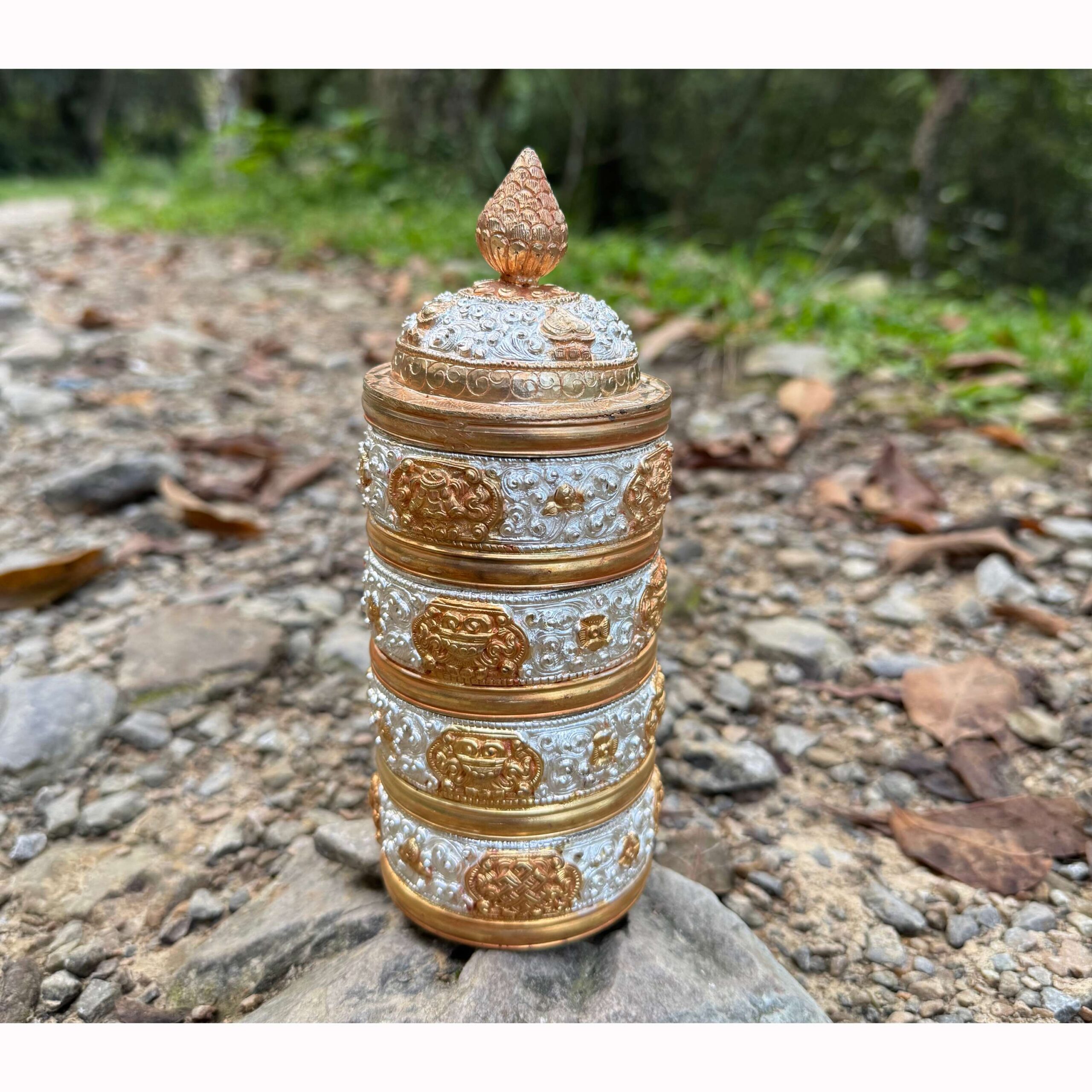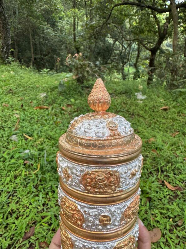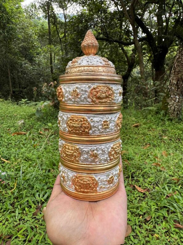 The Dopor, also known as Nesi, is a traditional vessel used in Tibetan Buddhist practices to offer rice as part of spiritual rituals and ceremonies. This sacred object is intricately crafted and symbolizes generosity, devotion, and the accumulation of merit.