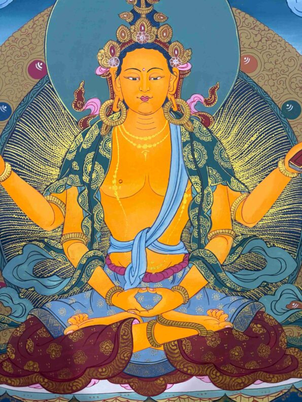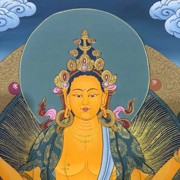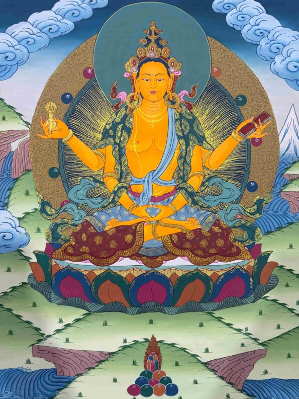 Prajnaparamita embodies the bliss/emptiness that gives rise to all phenomena—hence her title as The Mother of all Buddhas. She appears as a seated figure clothed in silks; her body is gold in color, and she has one face and four arms.