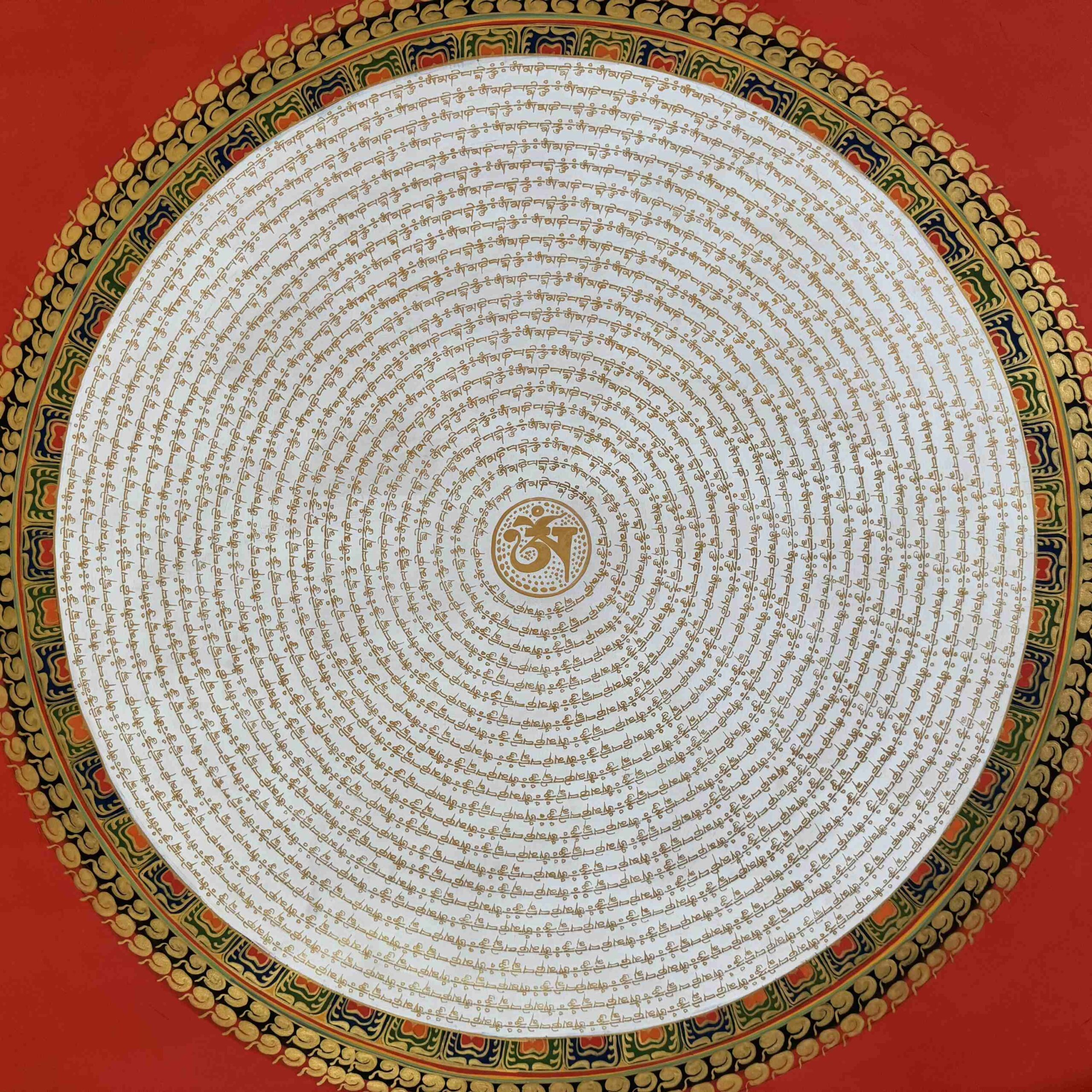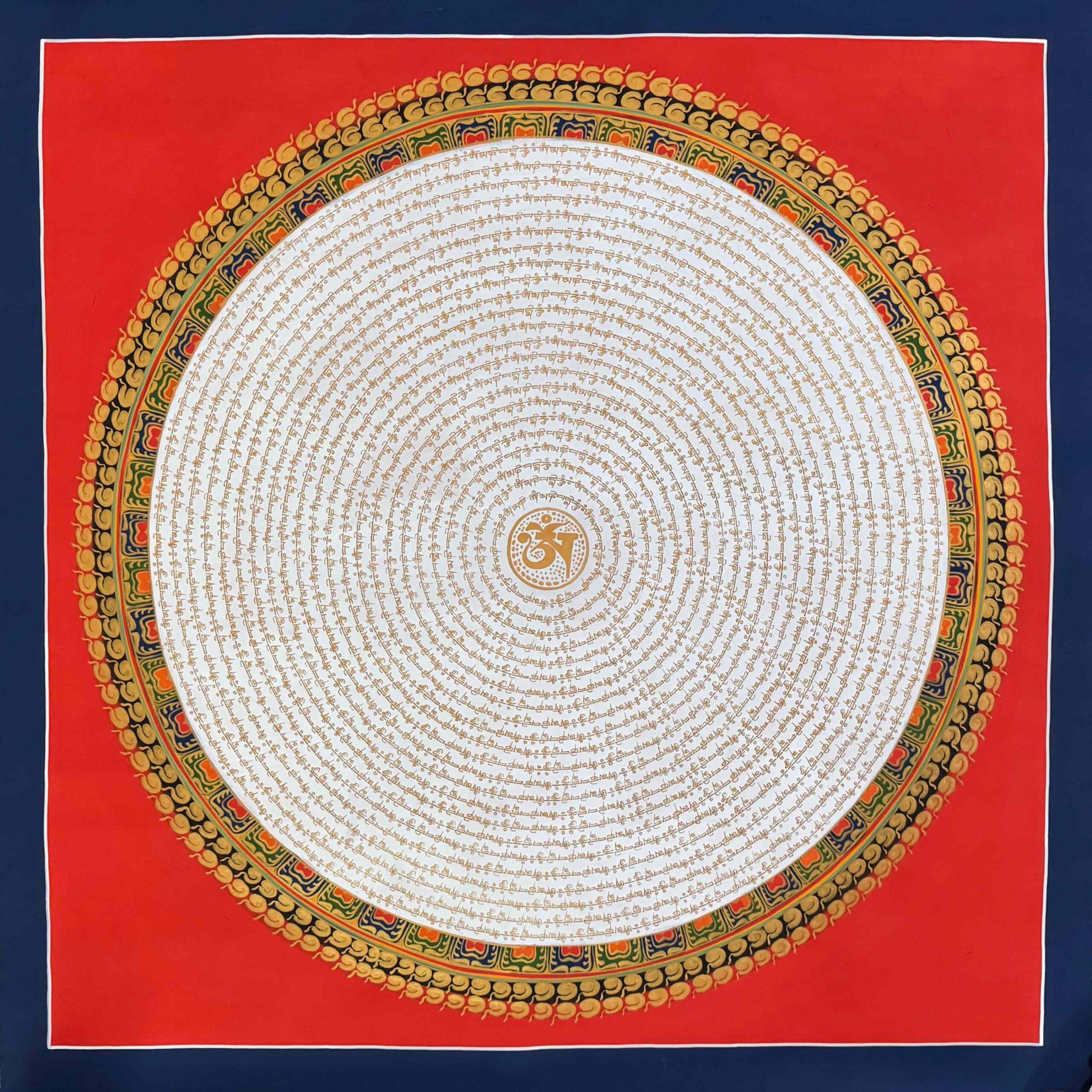 In the painting you can see that outer layer is the fire meaning that all your negative emotions such as hatred, anger will be burnt. And in the middle OM is surrounded by prayer “Om Mani Padme Hum”.