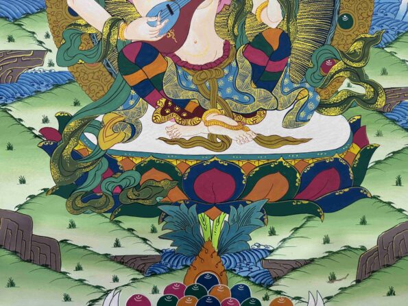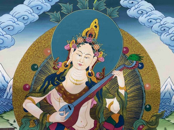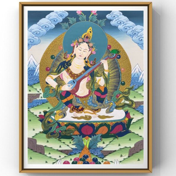 Saraswati is mostly worshipped for knowledge and education(learning and wisdom). She has one face and two hands holding vina -a stringed instrument and a book. Her legs are crossed and slightly raised and the vina is placed on her lap. She is white in color, seated on a simply drawn large white lotus. Her legs are drawn up in an unusual cross ankled posture with her knees raised, presumably a posture for musical performance. She is popular with Buddhist, Hindus, and Jains as well. The Buddhists regarded as one of the twenty-one emanations of the goddess Tara.