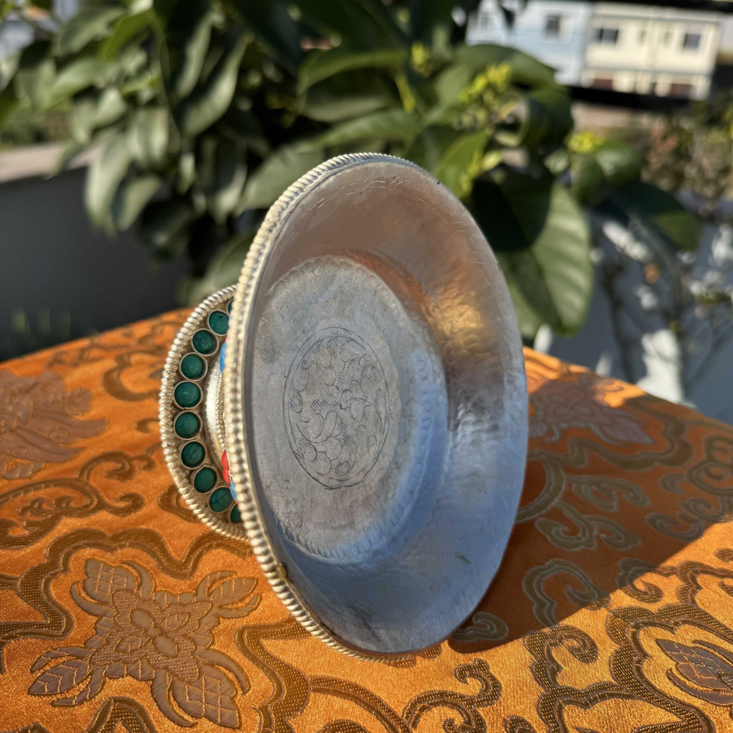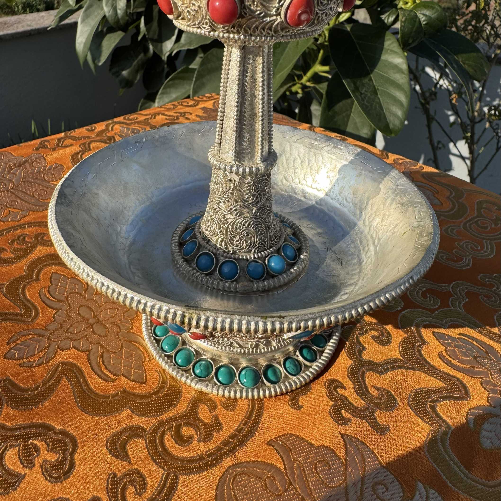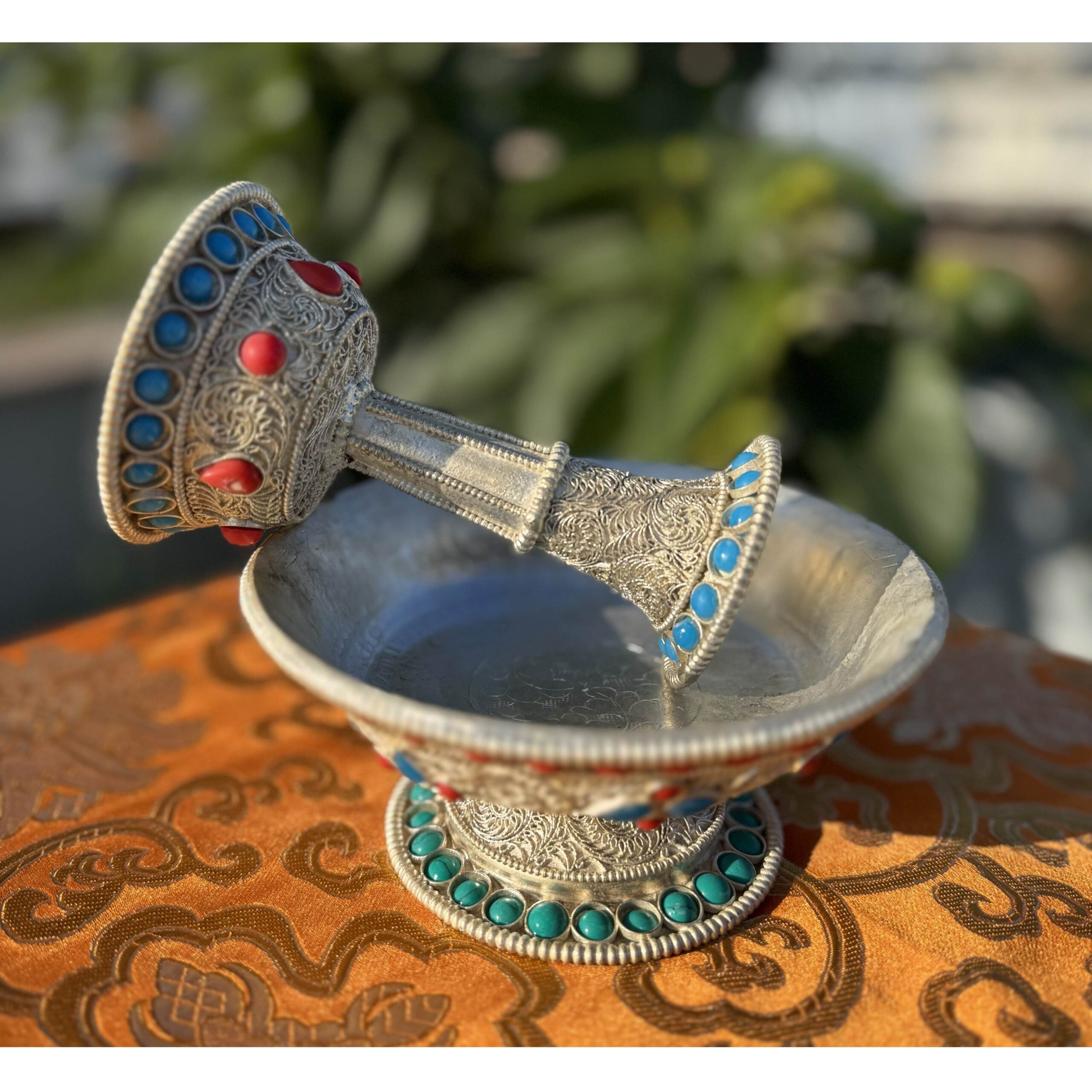 This Serkyem Set is made of copper alloy and is intricately hand engraved designs on both the top and lower Serkyem Set parts. This finely carved Serkyem Set is crafted by the master artisans of Patan, Nepal.