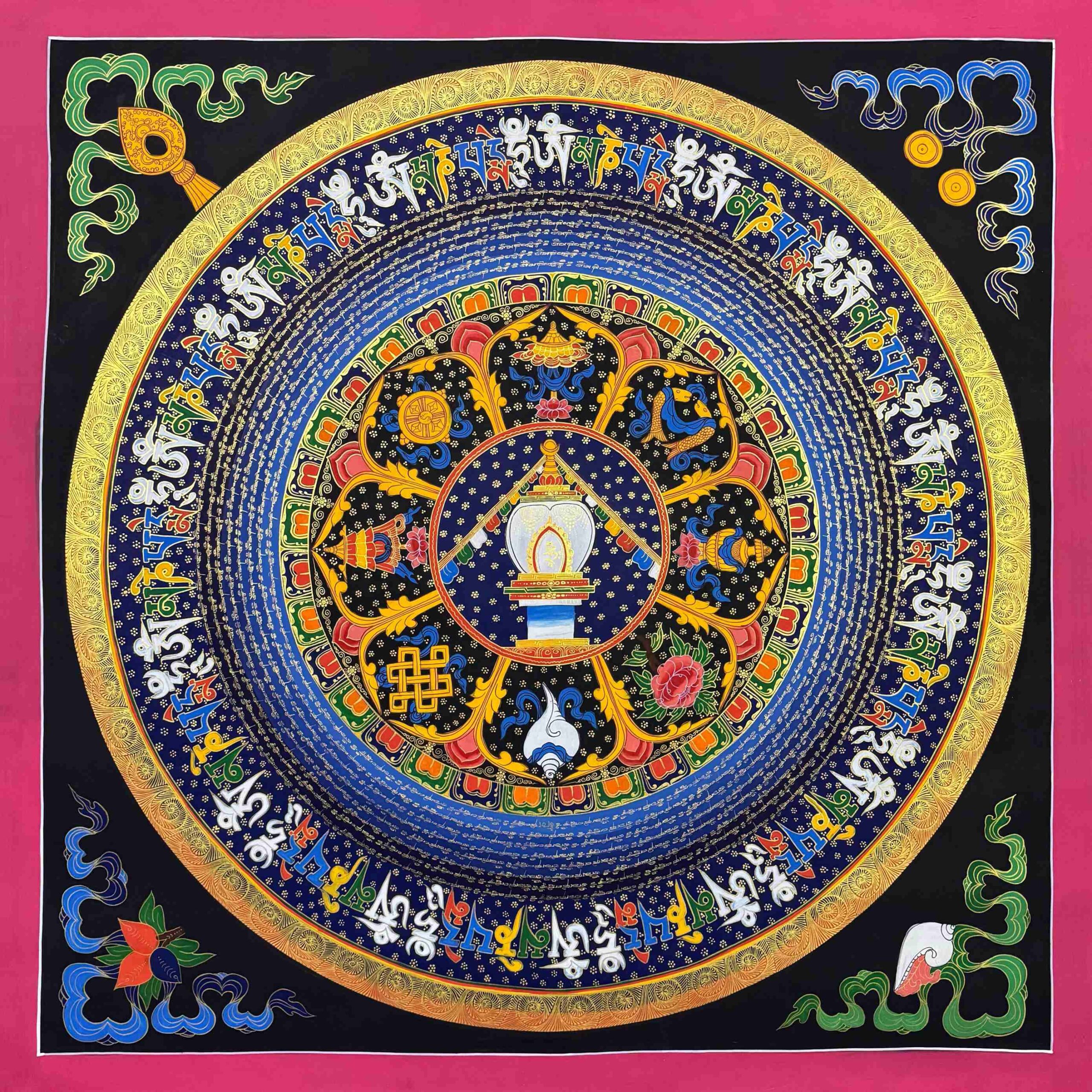 In the painting you can see that outer layer is the fire meaning that all your negative emotions such as hatred, anger will be burnt. And in the middle OM is surrounded by prayer “Om Mani Padme Hum”.