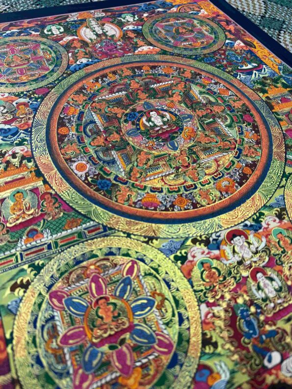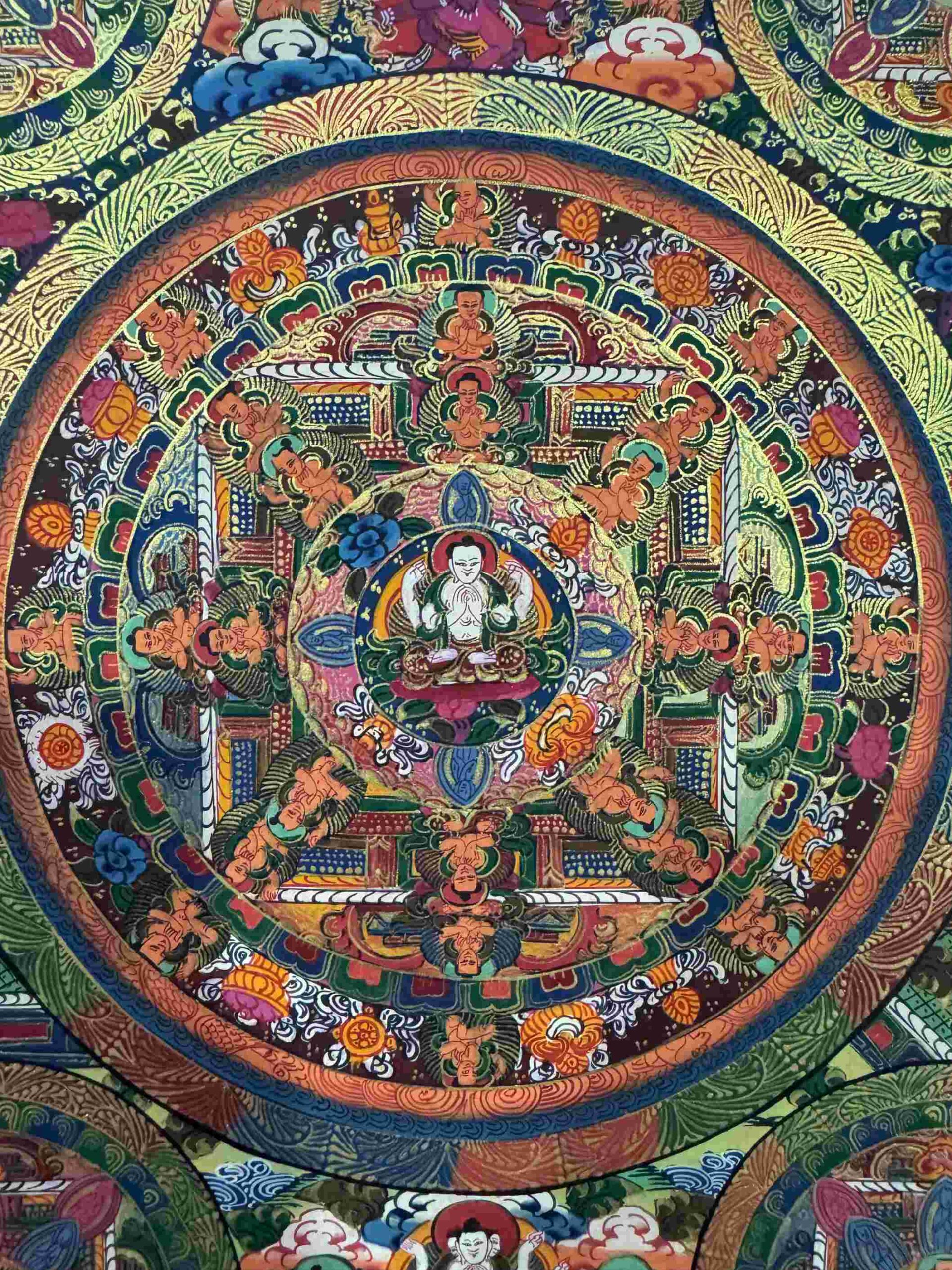 Silk brocading is a process of framing a Thangka in traditional Tibetan style. The frame is made of beautiful silk fabric having rich colors and patterns. The silk fabric protects the edges of the Thangka, and also makes it easier to hang. A thin silk cover protects the painting when rolled, and may be gathered up to display the painting when hung on the wall. It is generally thought that silk brocade renders a Thangka more attractive and more religious.