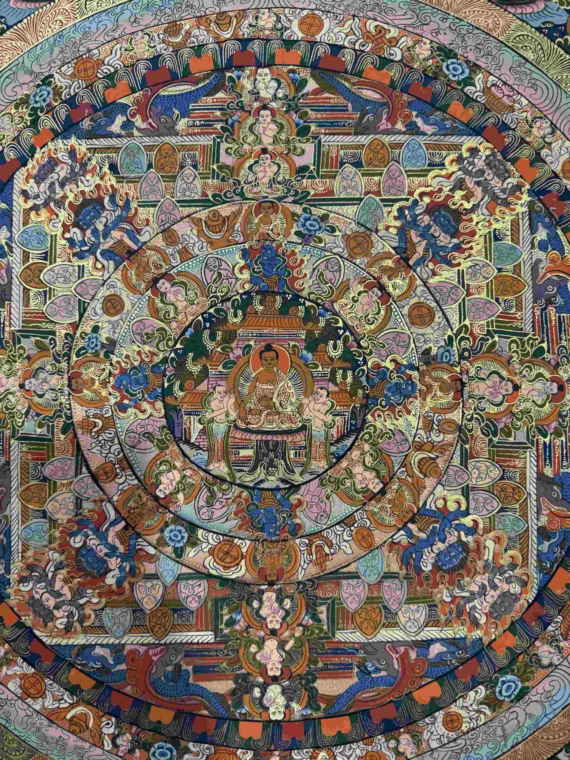 In the Mandala, there are four rings with fire that burns impurities and ignorance contains within every individual being and leads towards enlightenment, cemetery, where powerful and enlightened beings medate to push them towards Nirvana, wind or devas purifies the negative deeds or Karma ,and lotus implant purity and compassion to get into center to achieve Nirvana, here represented by Buddha.