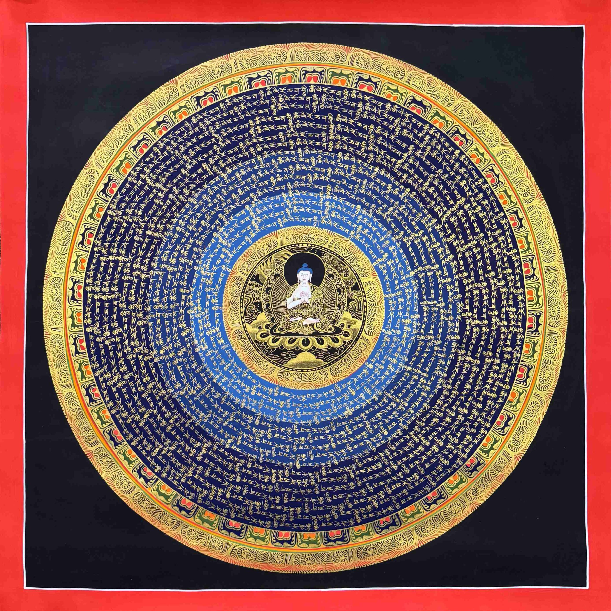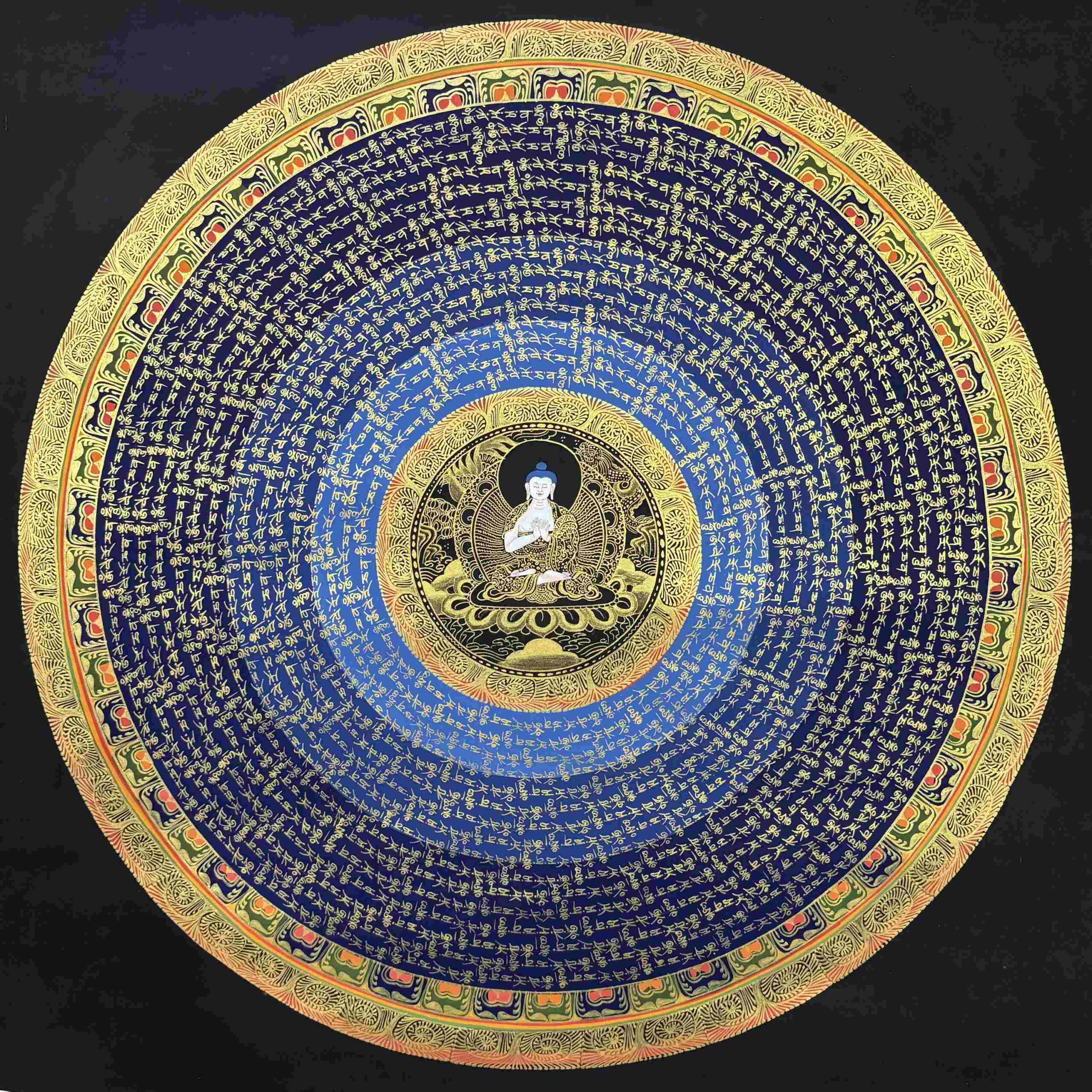 This Vairocana Mantra Mandala Thangka is a stunning hand-painted artwork that radiates spiritual harmony and sacred geometry. At the center of the mandala sits Vairocana Buddha, the primordial Buddha who represents the embodiment of wisdom and the essence of enlightenment. He is depicted in serene meditation posture, seated on a lotus throne, symbolizing purity and spiritual awakening.