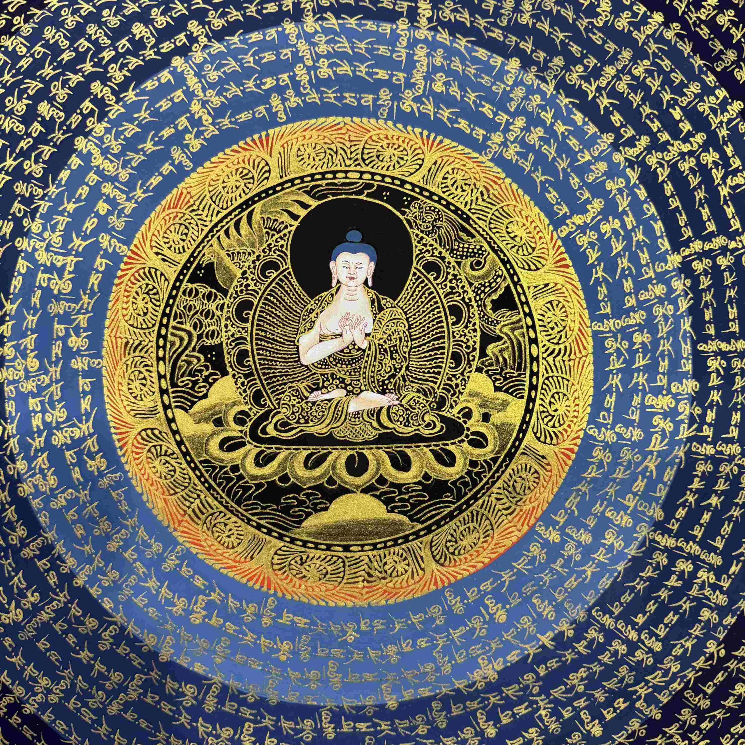 The thangka’s deep blue and golden tones convey both tranquility and transcendence, while the outer borders adorned with traditional motifs enhance its sacred beauty. This mandala serves as a powerful meditative tool and a visual representation of the enlightened mind — guiding practitioners toward wisdom, purification, and the realization of ultimate reality.