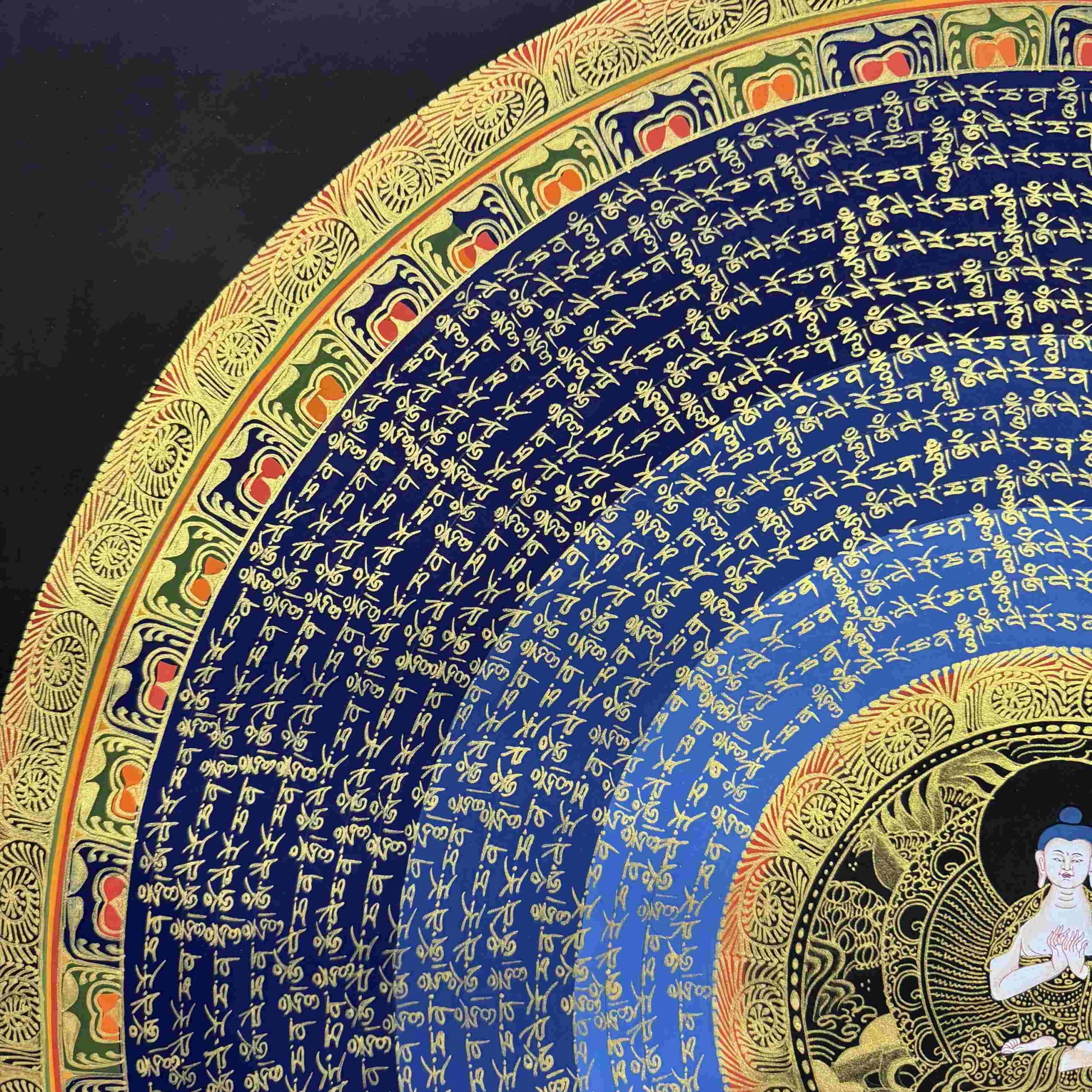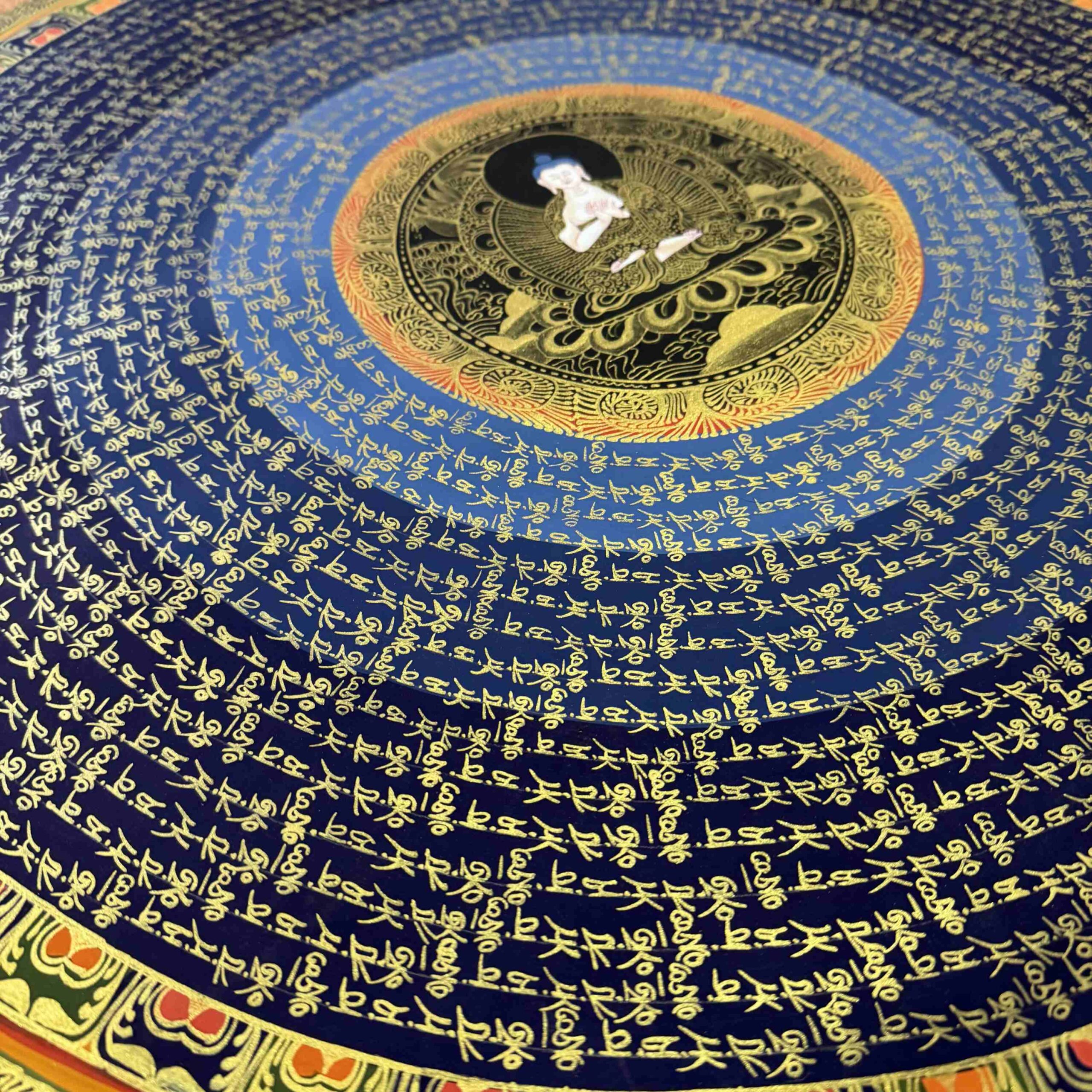 Surrounding the central figure are intricately inscribed mantras written in fine golden script, meticulously arranged in circular patterns that expand outward like ripples of divine energy. These sacred syllables represent Vairocana’s mantra, which invokes inner clarity and the illumination of universal truth.