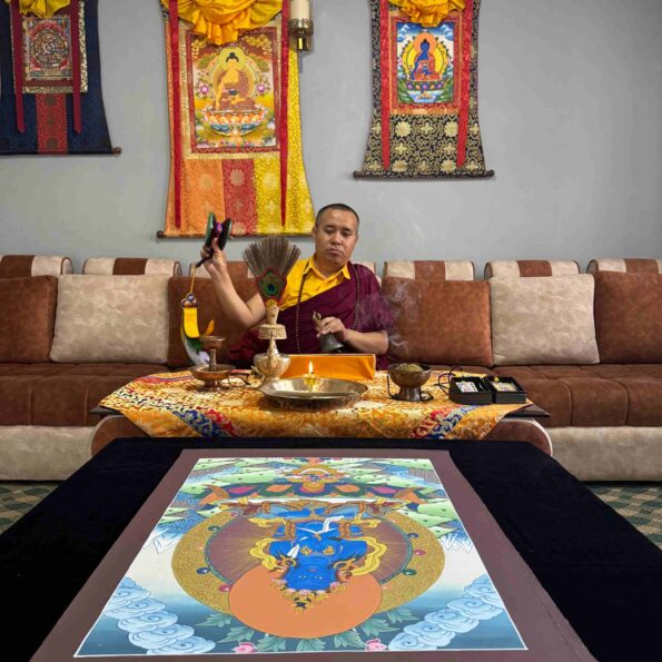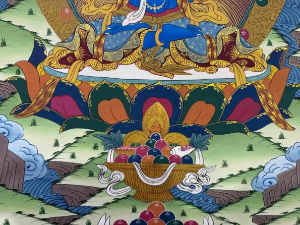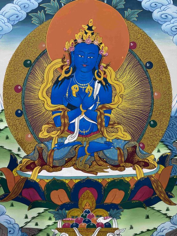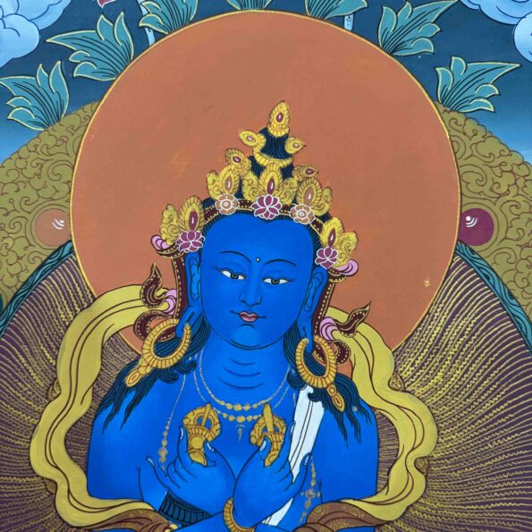 Vajradhara Bodhisattva is a central figure in Tibetan Buddhism, often considered the primordial Buddha or the source of all Buddhas. Depicted in deep blue with his hands crossed at his chest, holding a vajra (thunderbolt) and a bell, Vajradhara represents the union of wisdom and compassion. He embodies the ultimate, unchanging truth and is the foundation of all tantric teachings. In Vajrayana, the esoteric school of Buddhism, Vajradhara is viewed as the Dharmakaya, or the formless aspect of Buddhahood, symbolizing the enlightened mind.