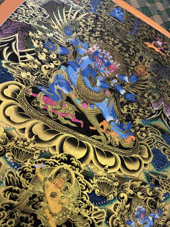 Vajrakilaya is commonly depicted with three faces, each carrying profound symbolism. The central wrathful face signifies the eradication of ignorance, the left face embodies compassion, and the right face symbolizes wisdom.