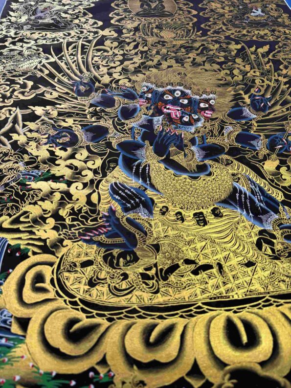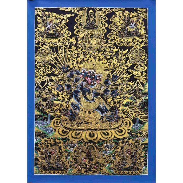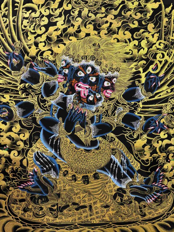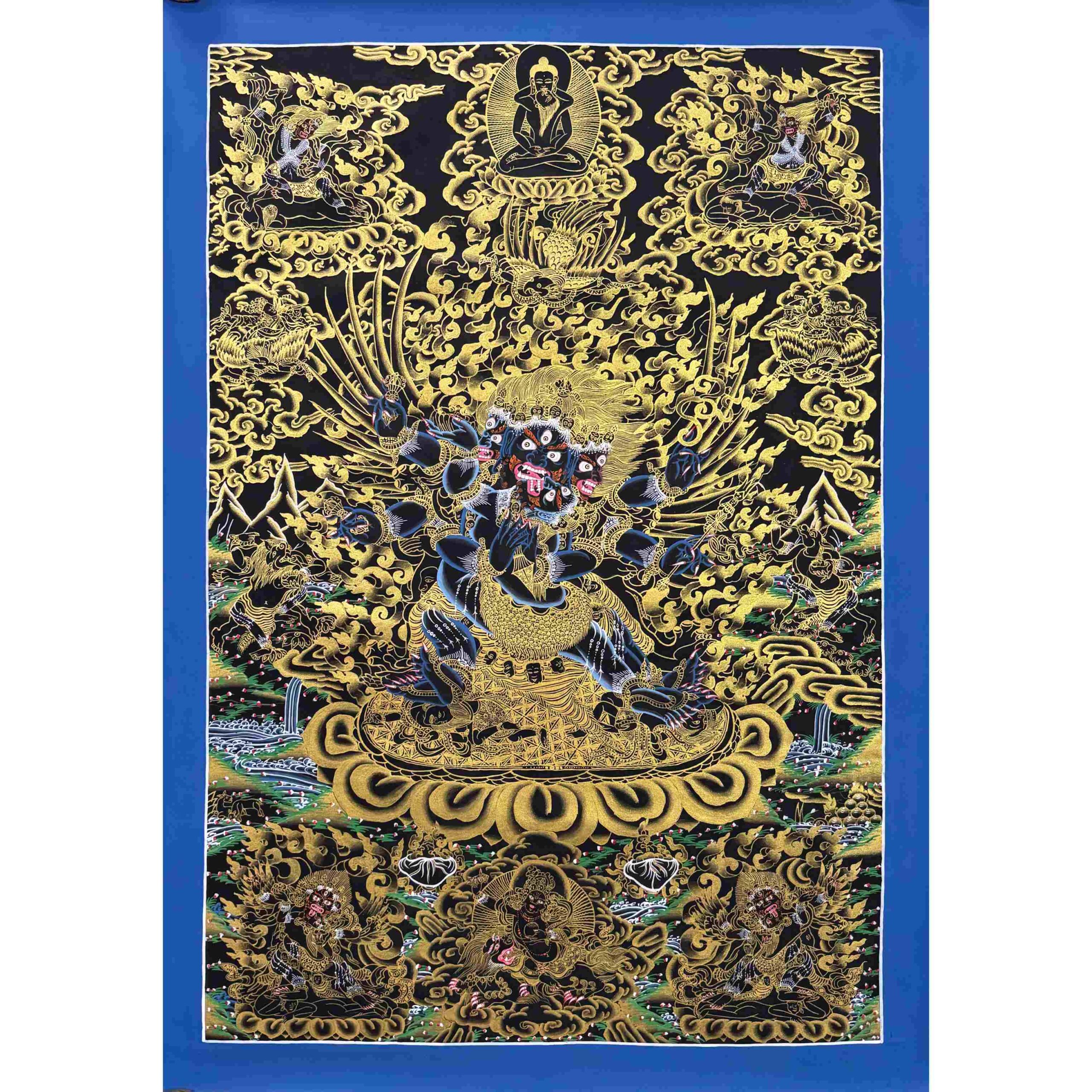 Vajrakilaya is commonly depicted with three faces, each carrying profound symbolism. The central wrathful face signifies the eradication of ignorance, the left face embodies compassion, and the right face symbolizes wisdom.