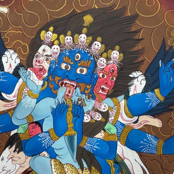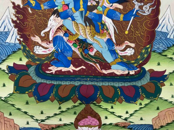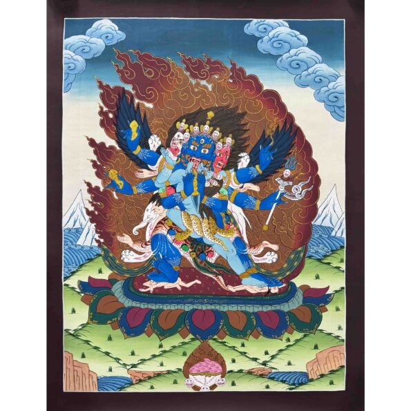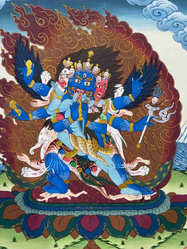 Vajrakilaya is commonly depicted with three faces, each carrying profound symbolism. The central wrathful face signifies the eradication of ignorance, the left face embodies compassion, and the right face symbolizes wisdom.