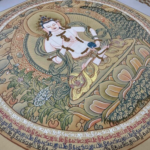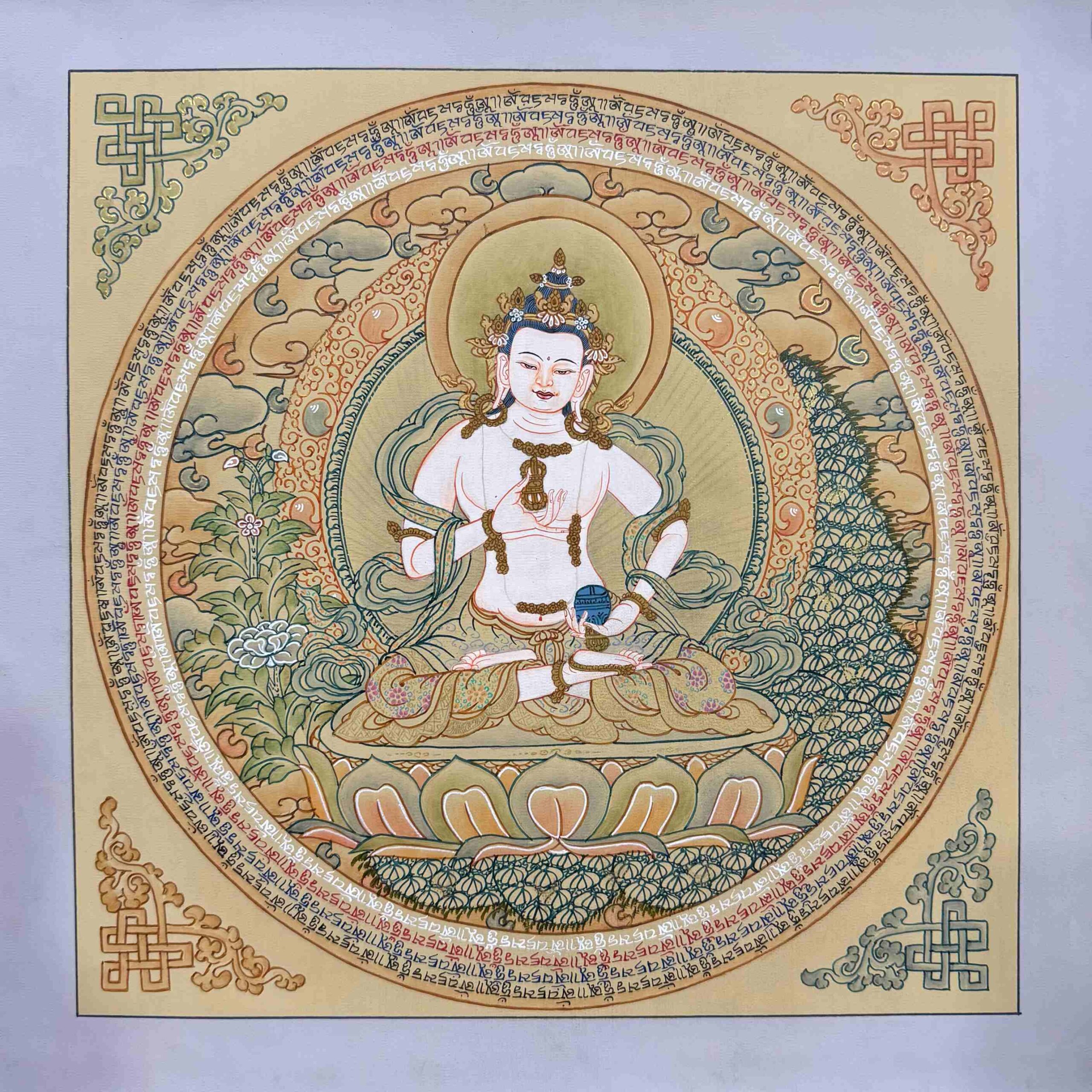 Vajarasattva symbolizes the purification of deluded perceptions that obscure enlightened mind. Vajarasattva holds in front of his heart a vajra, representing the minds enlightened essence and against his thigh, a bell representing insight into the empty nature of reality.