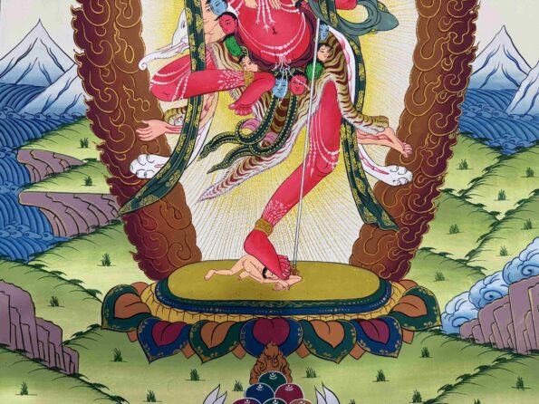 The Vajravarahi, the diamond yogini, wears a crown of five skulls symbolizes Vajravarahi’s power to transform the five negative afflictions. For the Vajrayana practitioners, they choose one of the Yidam deities to pursue life long path on spiritual development. We have heard and read stories where Mahasiddhas spent 12 years or so dedicating oneself to the practice of Vajravarahi, Chakrasamvara, Vajrayogini and so.