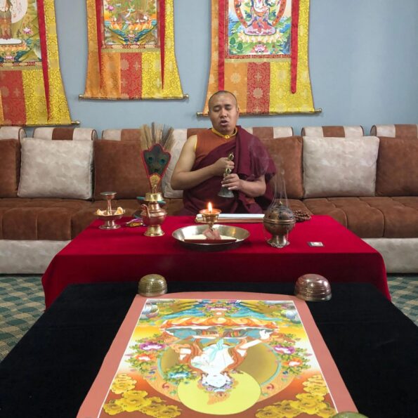 Silk brocading is a process of framing a Thangka in traditional Tibetan style. The frame is made of beautiful silk fabric having rich colors and patterns. The silk fabric protects the edges of the Thangka, and also makes it easier to hang. A thin silk cover protects the painting when rolled, and may be gathered up to display the painting when hung on the wall. It is generally thought that silk brocade renders a Thangka more attractive and more religious.