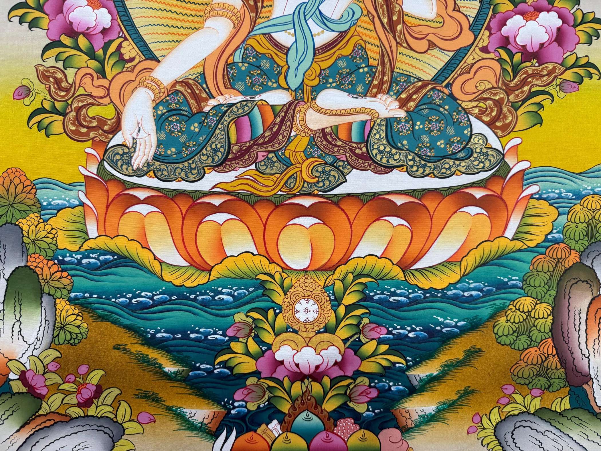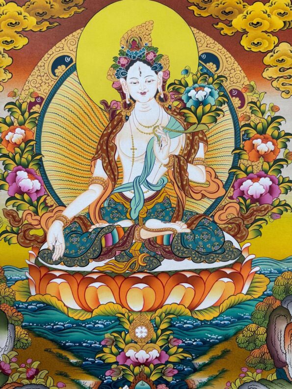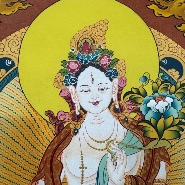 White Tara is goddess of compassion and healing of the Tibetan Buddhist tradition. She is depicted seating in lotus position with the soles of her feet pointing upward. Her left hand holds a beautiful blue lotus flower and her right hand is extended to her knee in the mudra of compassion. She has seven eyes symbolizing her power to see human afflictions. Another power of White Tara is to generate energy for good health and longevity.