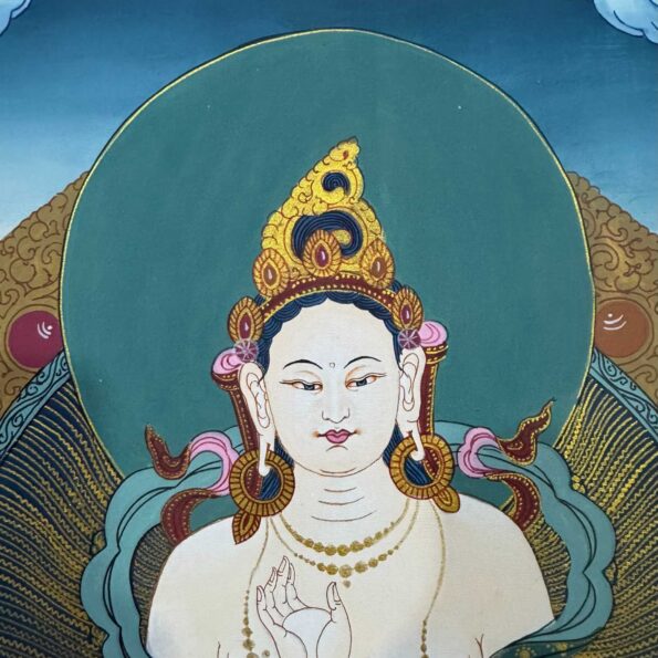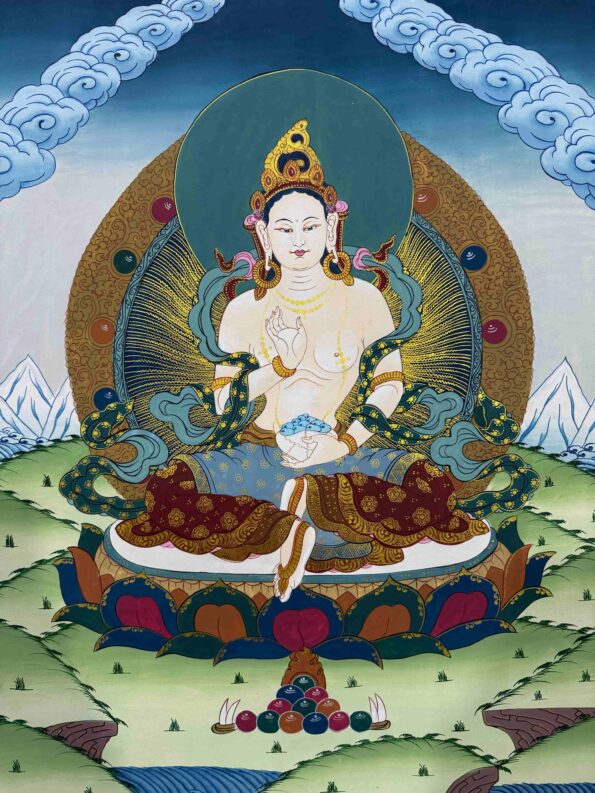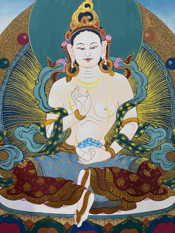 Her radiant presence exudes calm and compassion, with delicate features rendered in fine detail. The artist’s use of soft hues and intricate gold patterns highlights her divine energy and the peaceful aura she embodies. She holds a sacred vase symbolizing the nectar of wisdom, while her other hand is raised in a gesture of teaching and blessing.